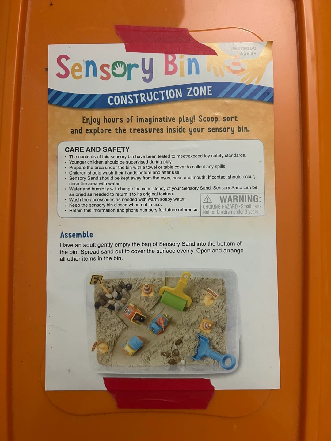 This sensory bin is all about construction fun! It includes kinetic sand, mini construction vehicles, traffic cones, and road signs. It's designed for hours of imaginative play. Great for little ones interested in building and vehicles!