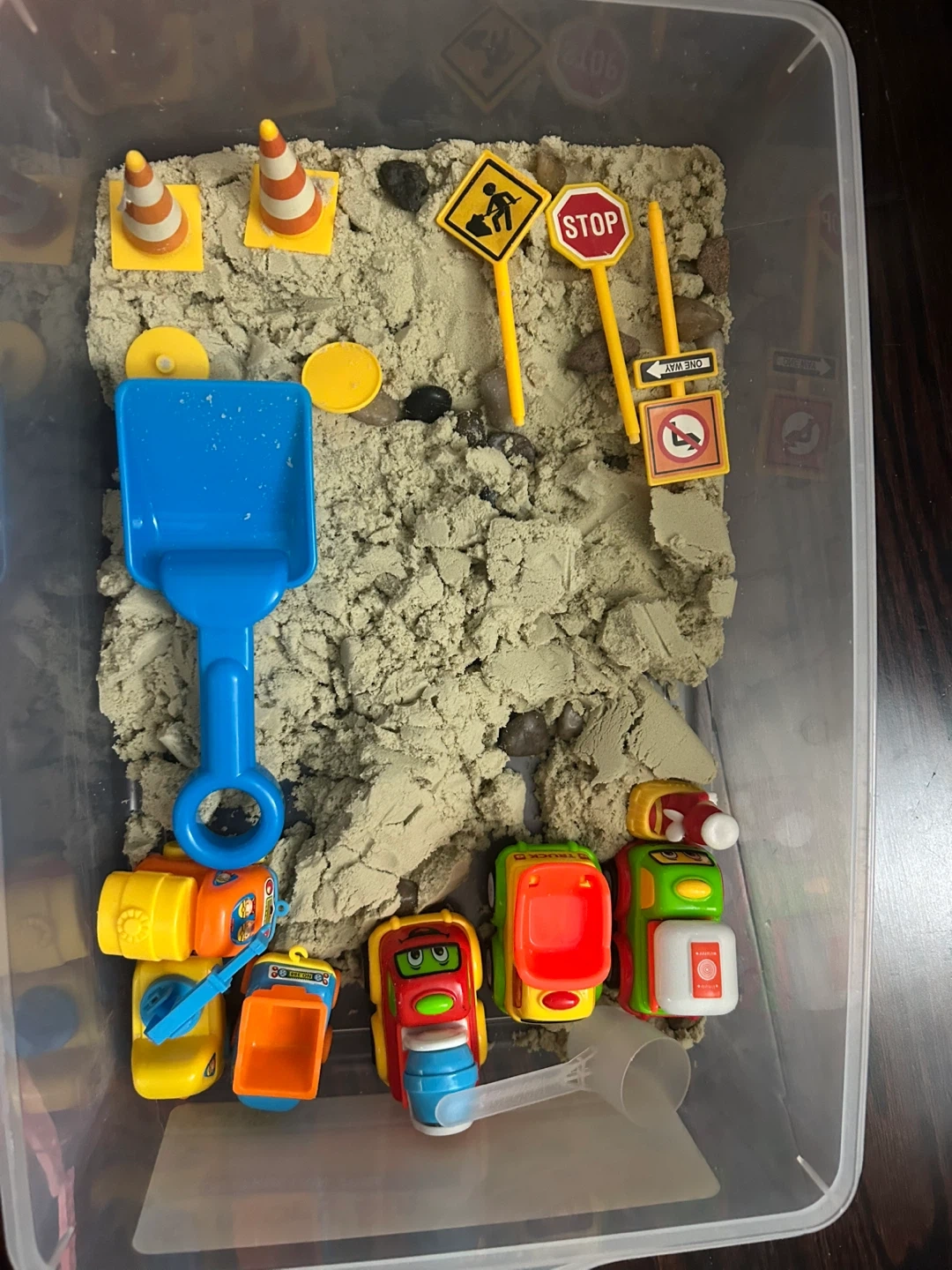 Sensory Bin Construction Zone with Kinetic Sand and Toys