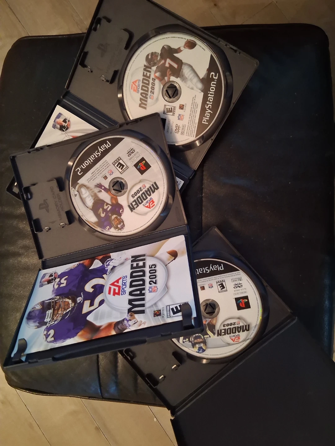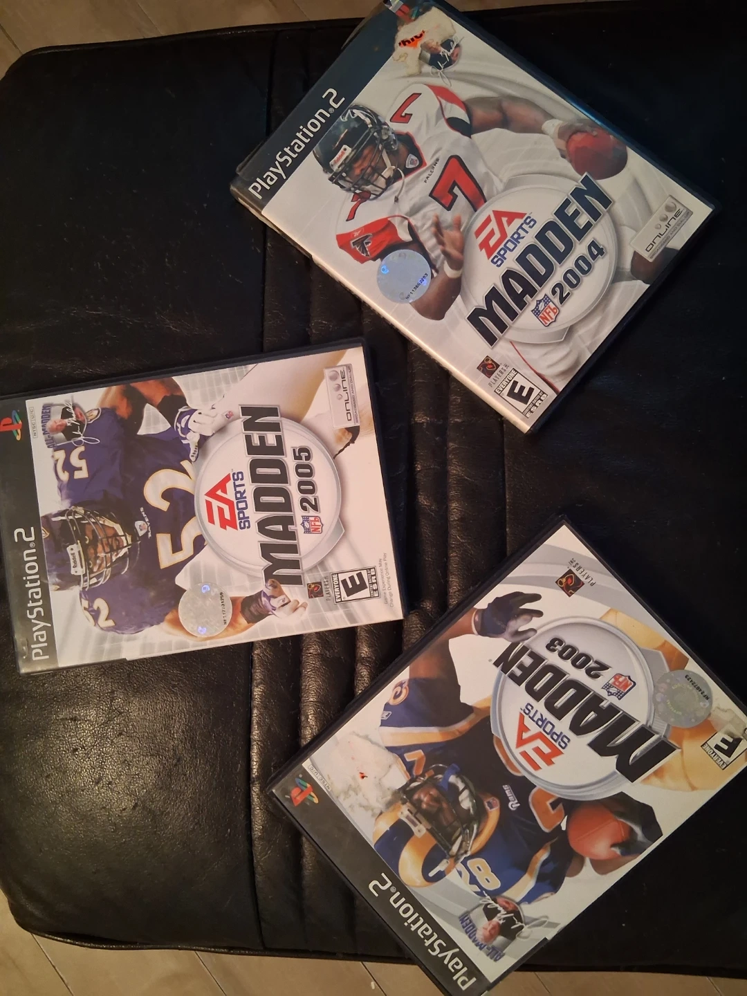 Three EA Sports Madden NFL video games for PlayStation 2. Includes Madden 2003, Madden 2004, and Madden 2005. These discs are for the PlayStation 2 console.