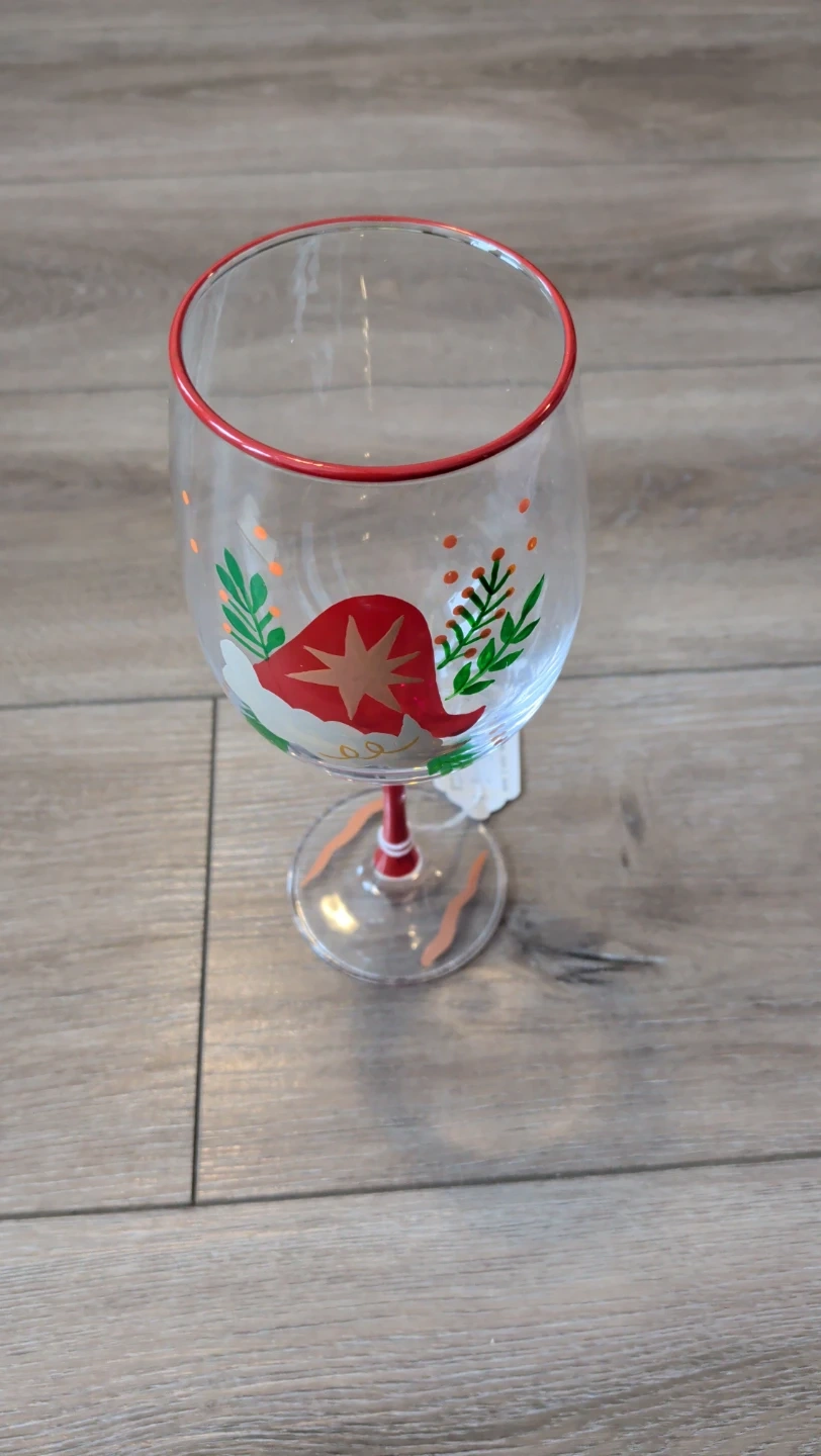 This clear wine glass features a festive hand-painted design of Santa's hat with holly and berries. It has a red rim and a red stem. Perfect for holiday beverages!