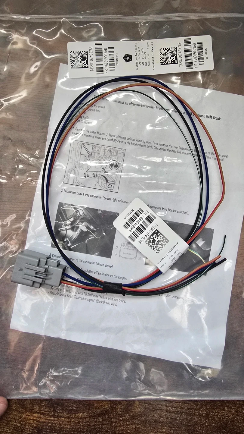 This wiring harness is for connecting an aftermarket trailer brake controller on a 2015 & beyond Ram Truck. It includes the necessary connector and wires for installation.