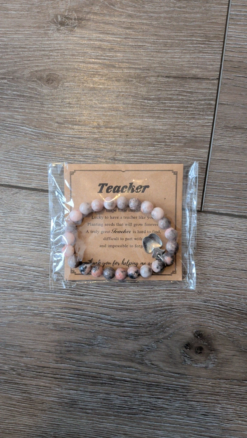 This bracelet features pink and grey beads with a silver-toned charm. It's designed as a thank you gift for a teacher. The beads are likely stone, and it's stretchy for a comfortable fit.
