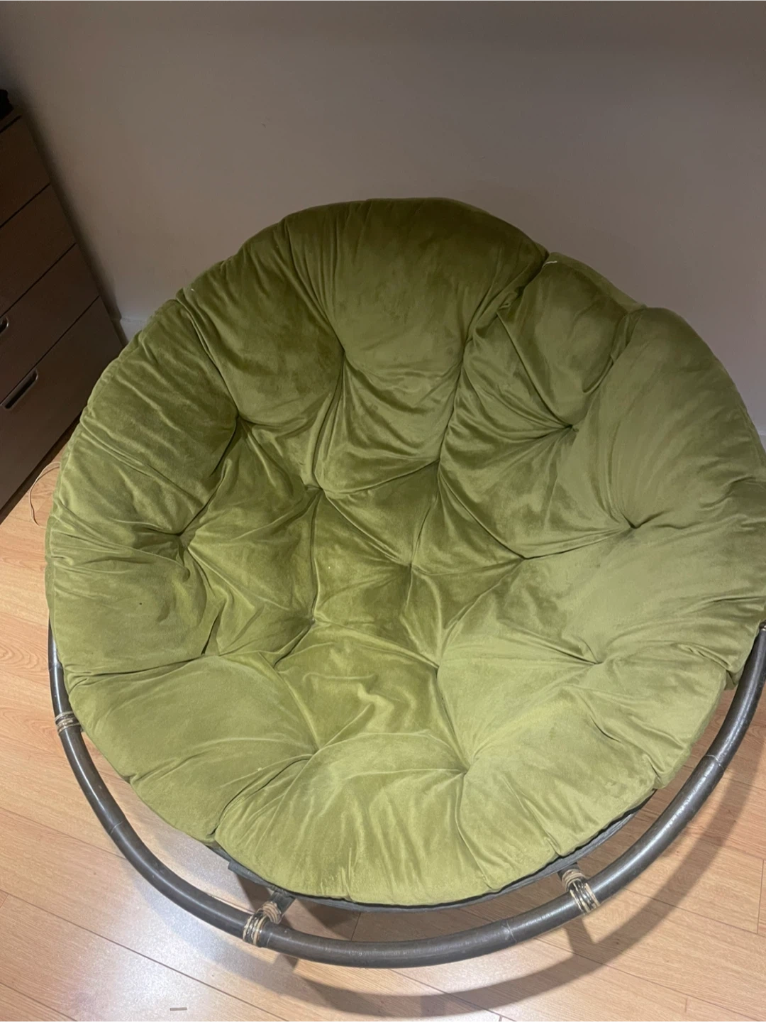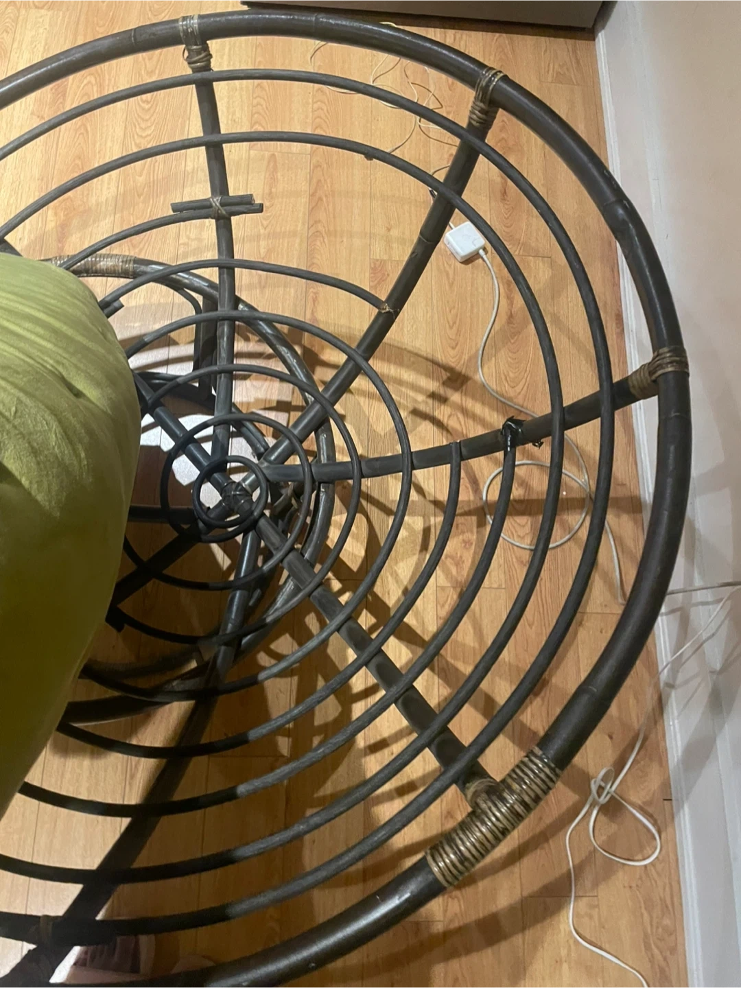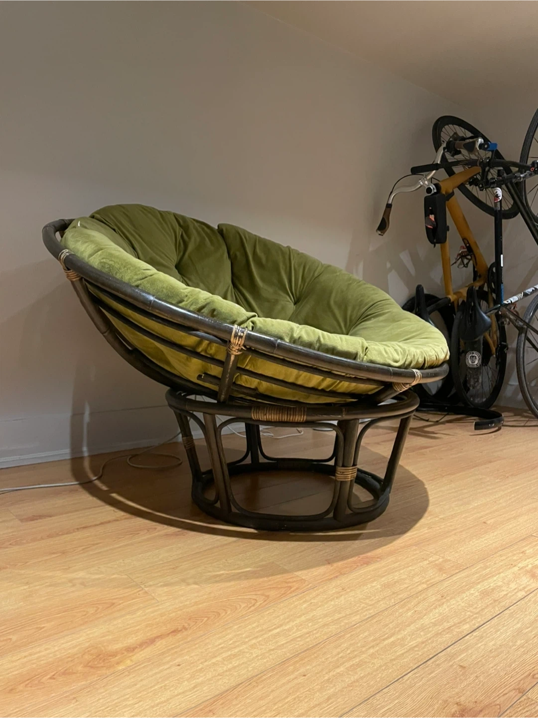 Comfy papasan chair with a plush green velvet cushion. The frame is made of dark wood with woven accents. See pictures for defects. Great accent chair!
