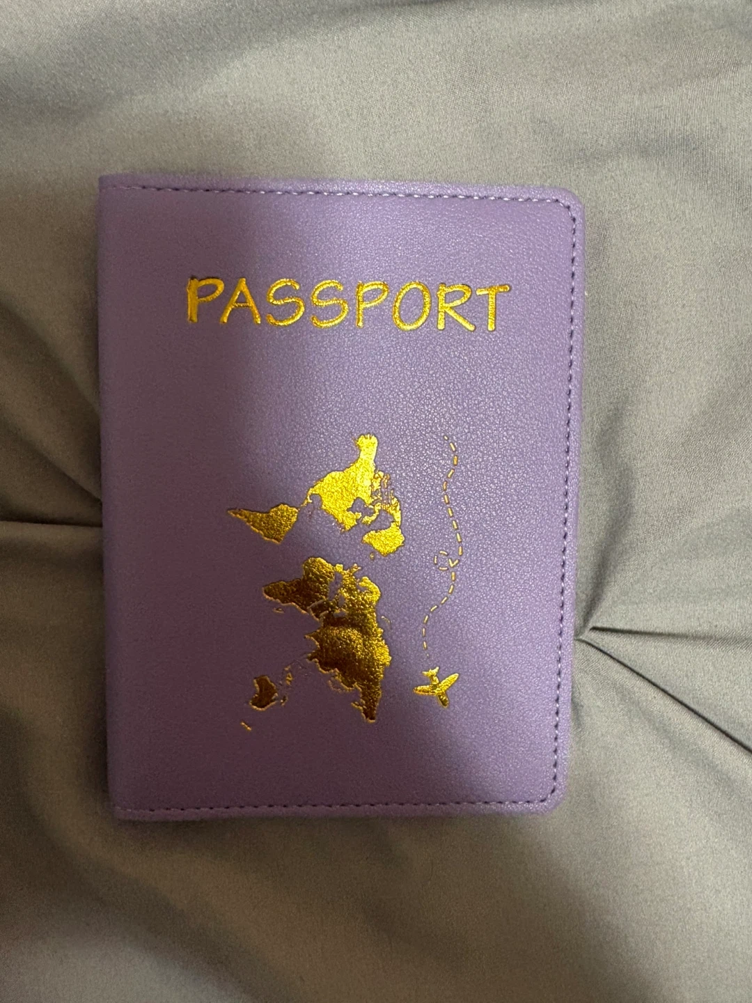 Keep your passport protected with this stylish lavender passport holder. It features a gold map design and a clear window for your ID. This holder's great for keeping your travel documents organized!