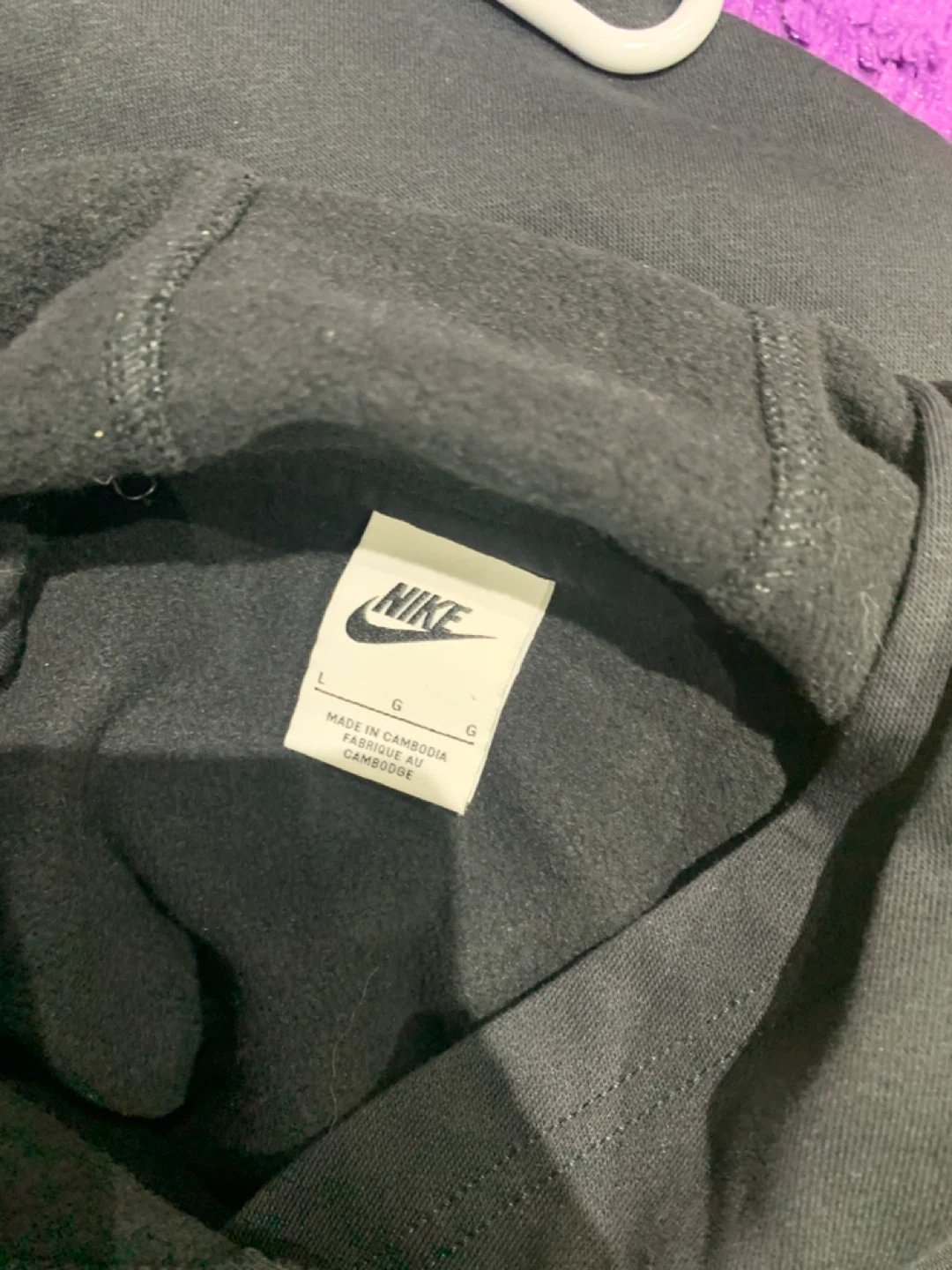 This is a black Nike hoodie with a large white swoosh logo. It's made in Cambodia. The size is L G which is a youth large. It's a pullover style with a front pocket.