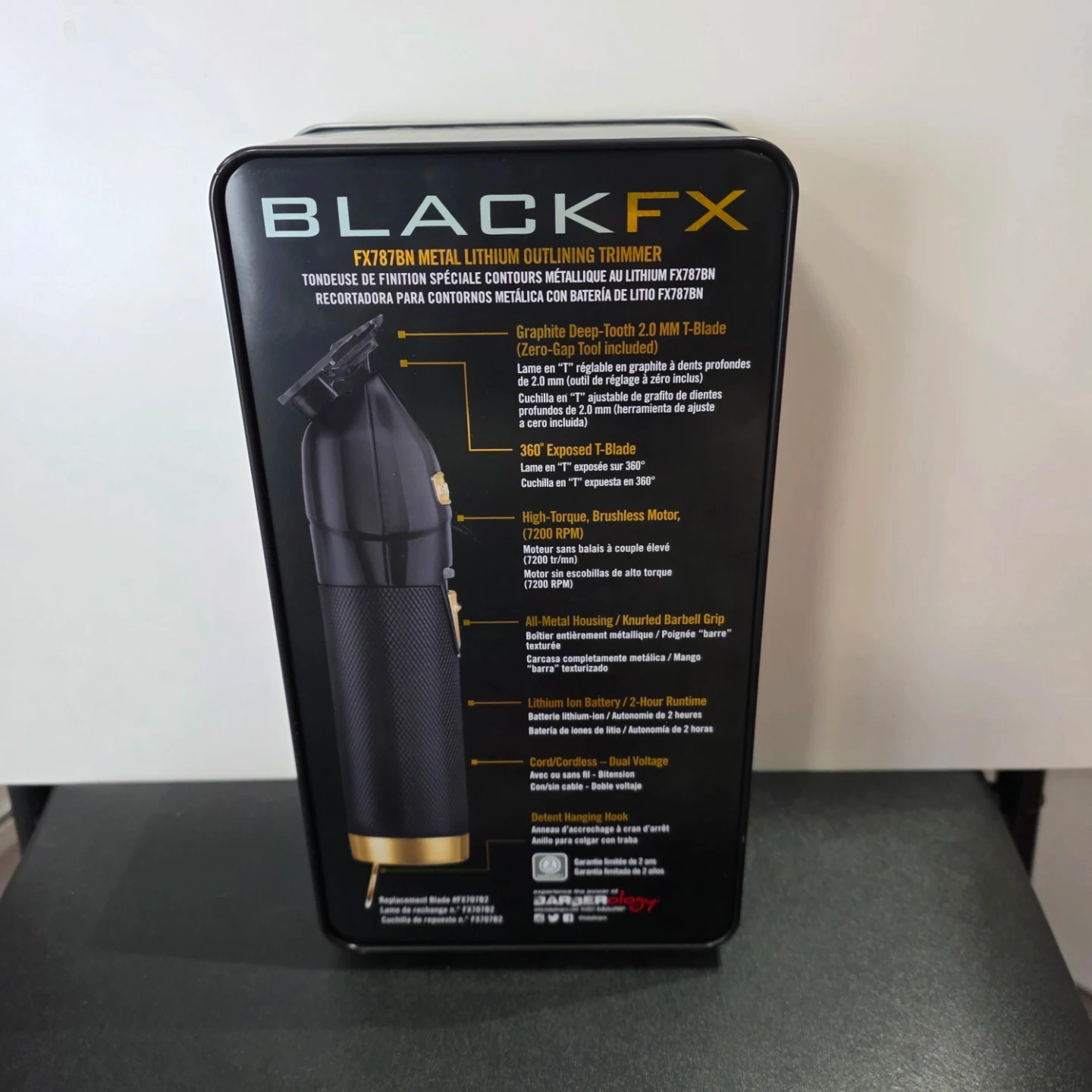 This BLACKFX FX787BN trimmer features a graphite deep-tooth 2.0 MM T-blade with zero-gap tool. It has a high-torque, brushless motor with 7200 RPM. The all-metal housing provides a comfortable grip. It includes a lithium ion battery with a 2-hour runtime and dual voltage charging cord.