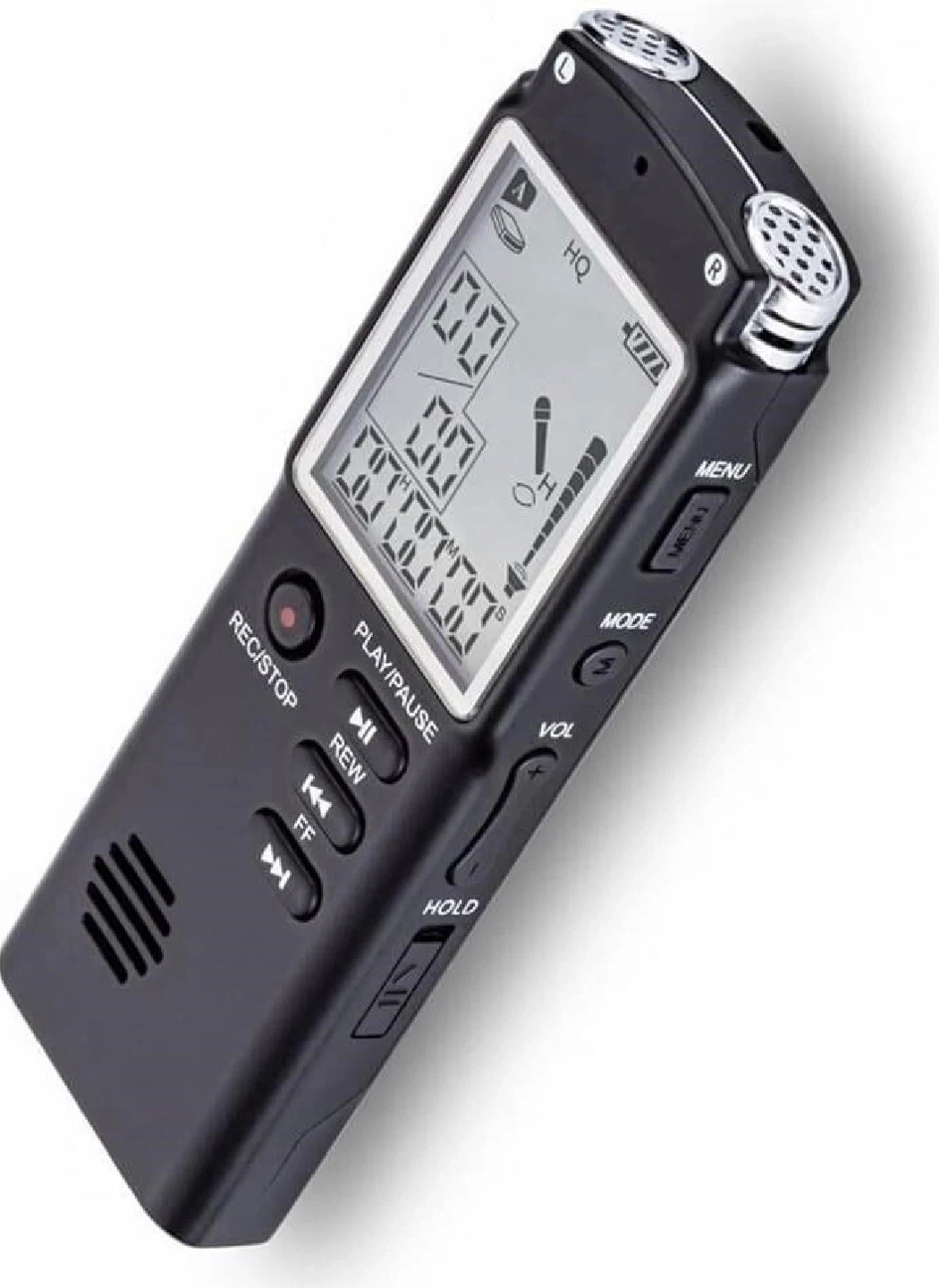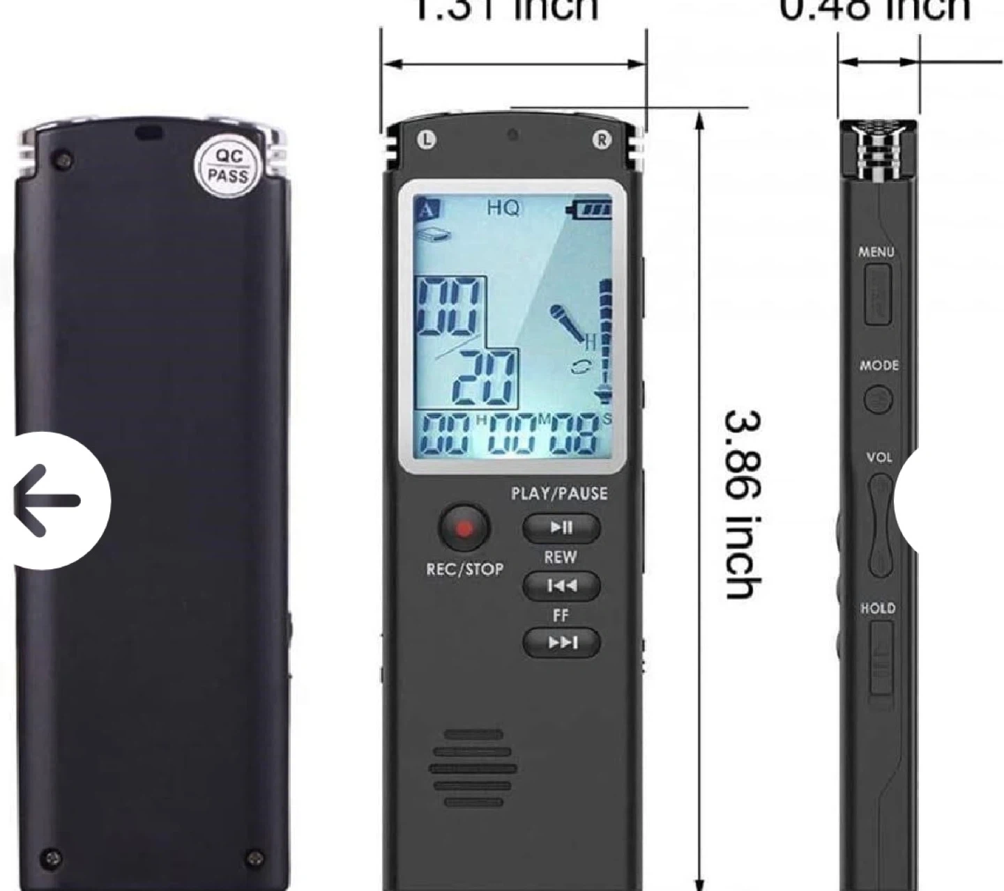 This is a black digital voice recorder. It has a clear LCD screen and multiple recording modes. Dimensions are 3.86 inches long, 1.31 inches wide, and 0.48 inches thick. Great for capturing lectures or meetings!