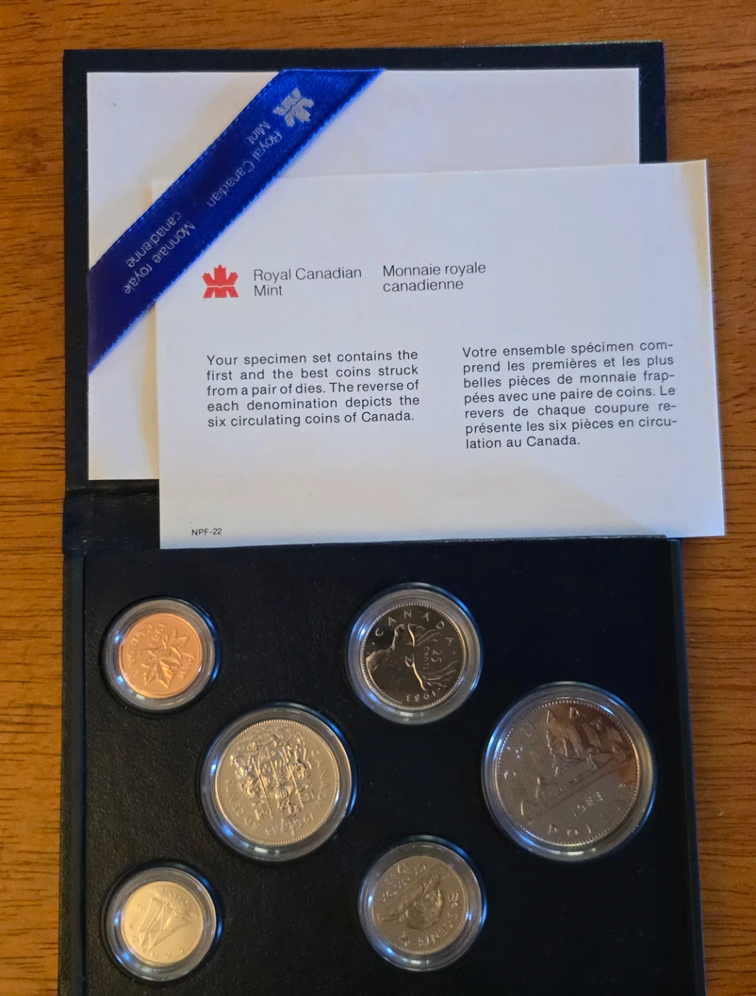 This Royal Canadian Mint specimen set contains the first six circulating coins struck from a pair of dies. It includes a 1 Dollar, 50 Cents, 25 Cents, 10 Cents, 5 Cents, and 1 Cent coin. The set features coins made of Nickel and Bronze.