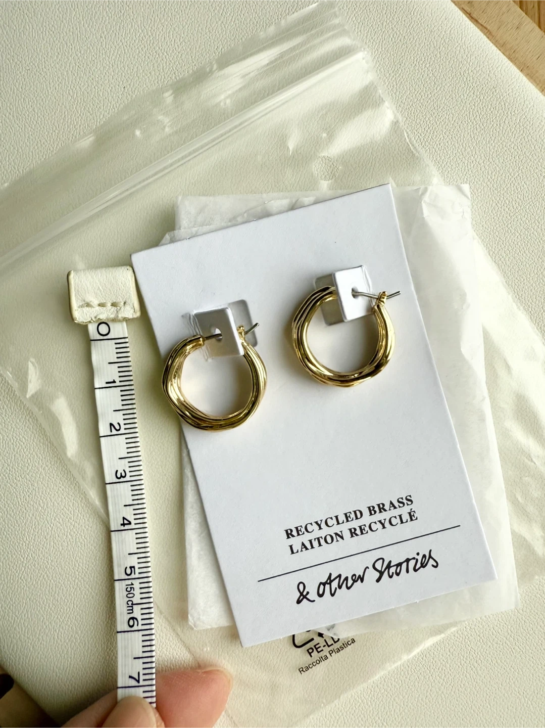 These & Other Stories hoop earrings feature a twisted design. They're made from recycled brass and have a gold tone. Perfect for adding a stylish touch to any outfit!