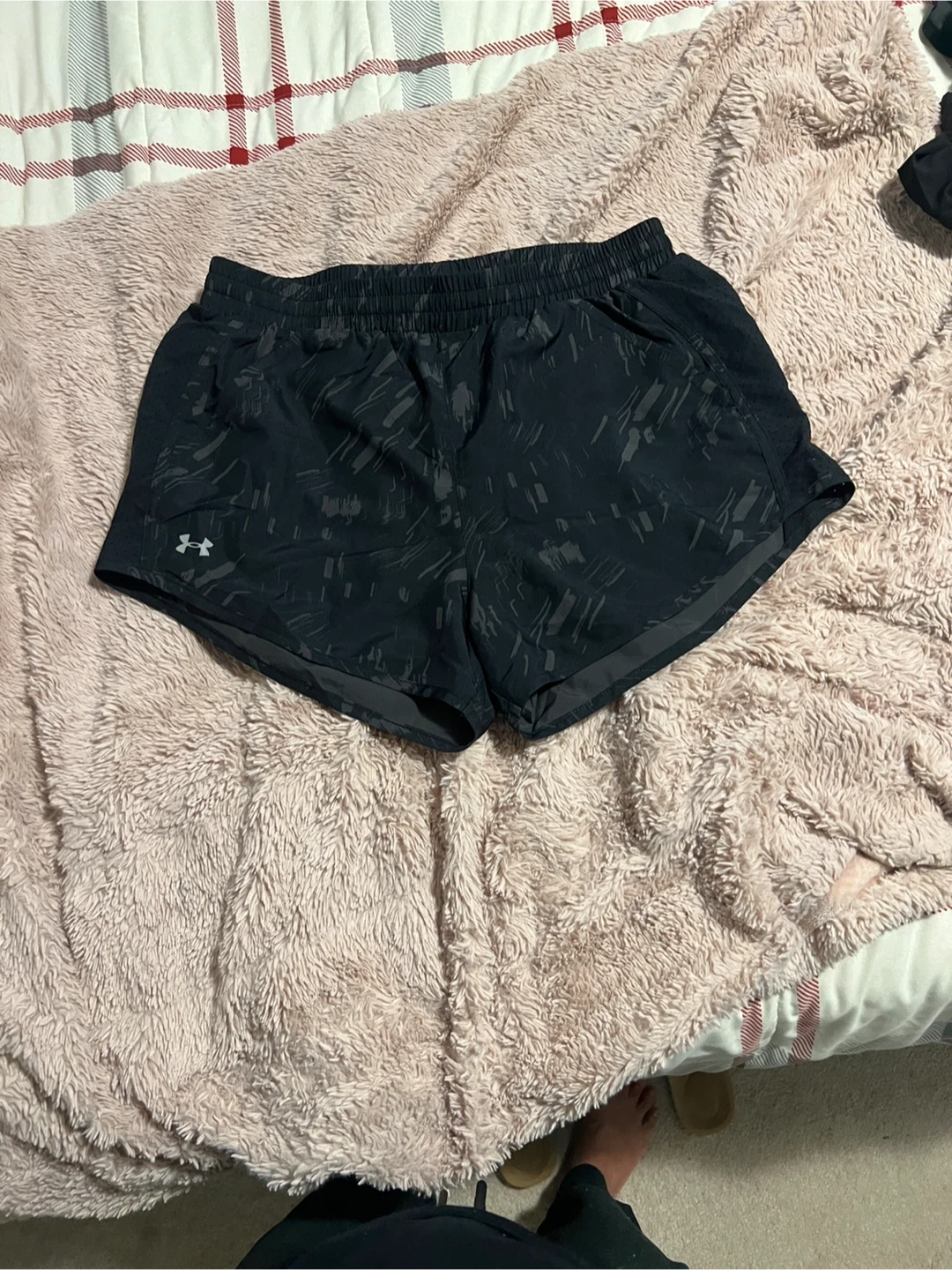 These black Under Armour running shorts are designed for performance. They feature a comfortable elastic waistband with a drawstring and a subtle all-over pattern. Made with lightweight material for breathability during workouts.