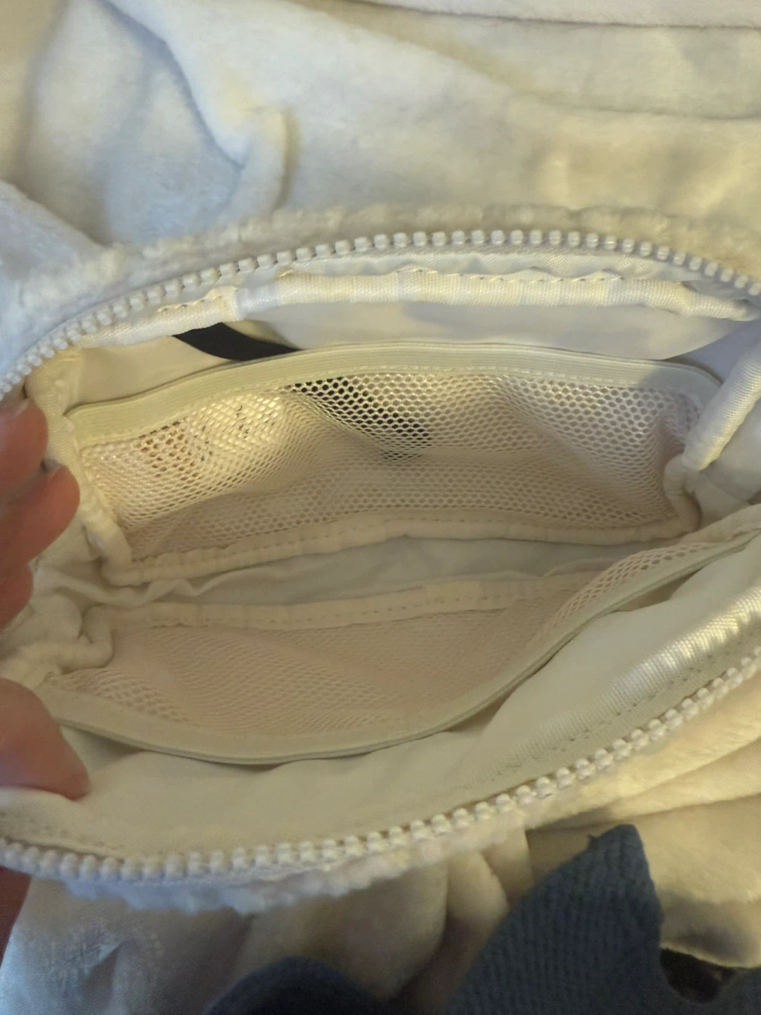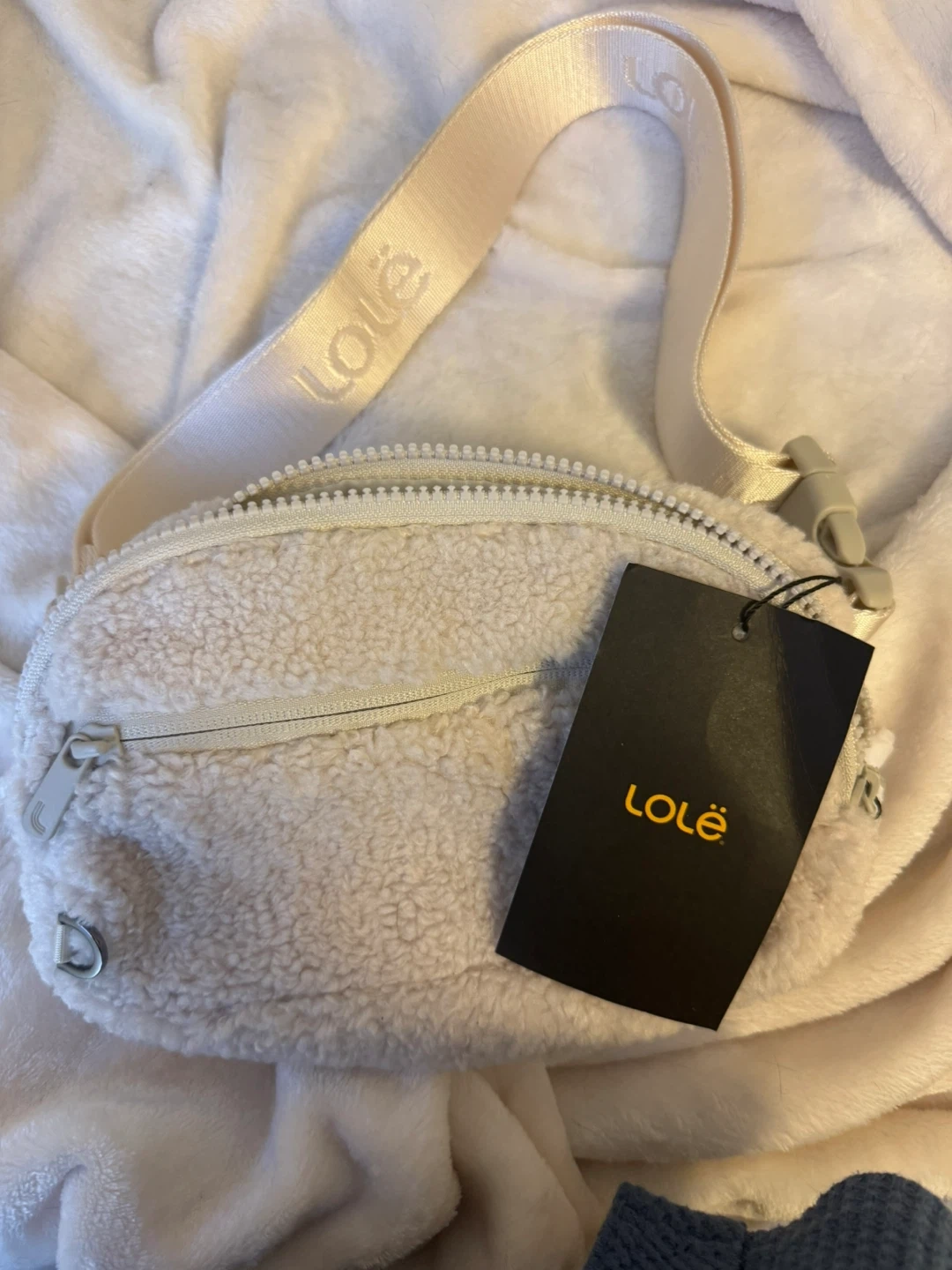 This Lole fanny pack is made from a soft cream-coloured teddy fleece. It has a zippered main compartment with an interior mesh pocket. The adjustable strap has the Lole logo on it.