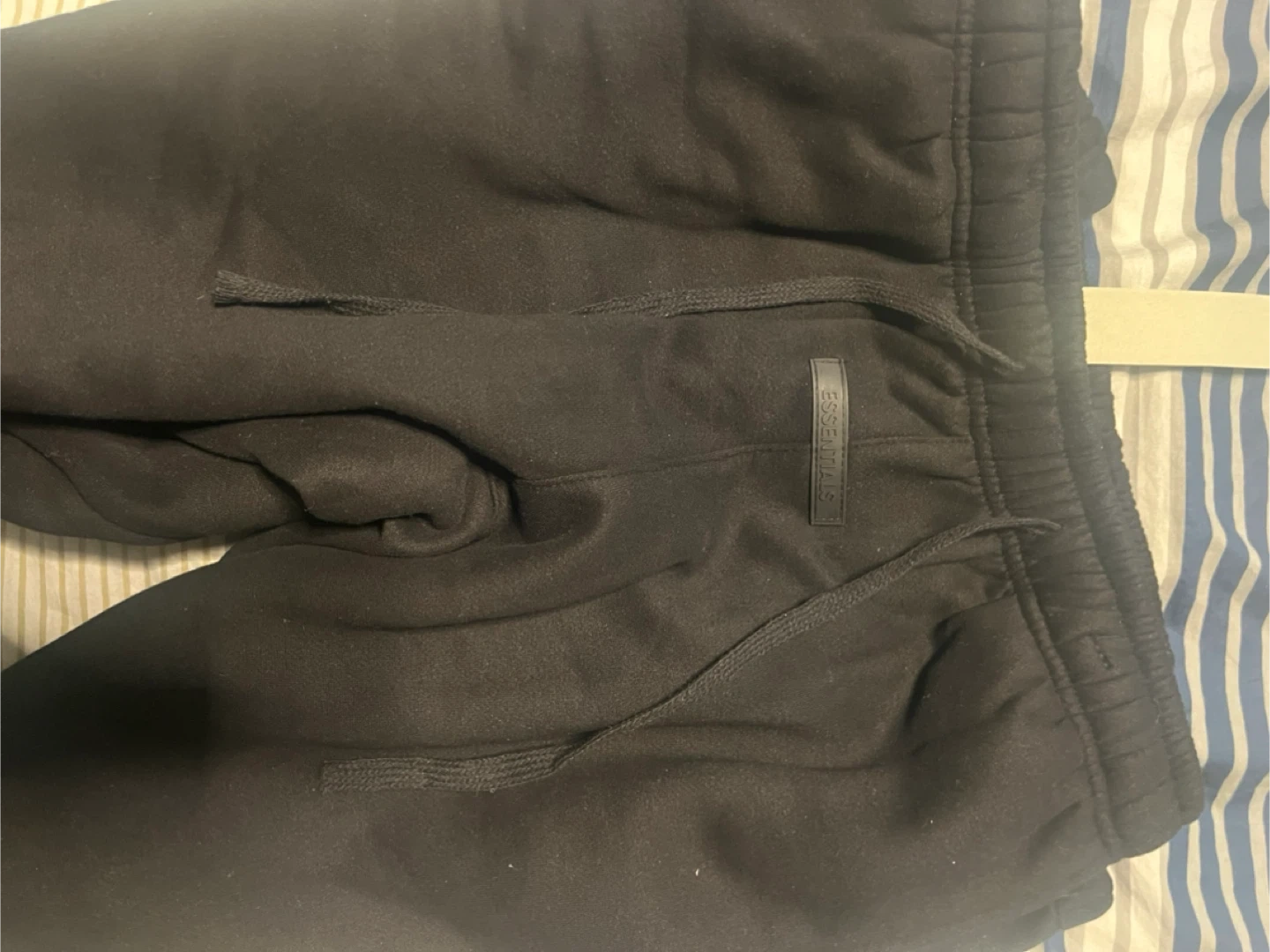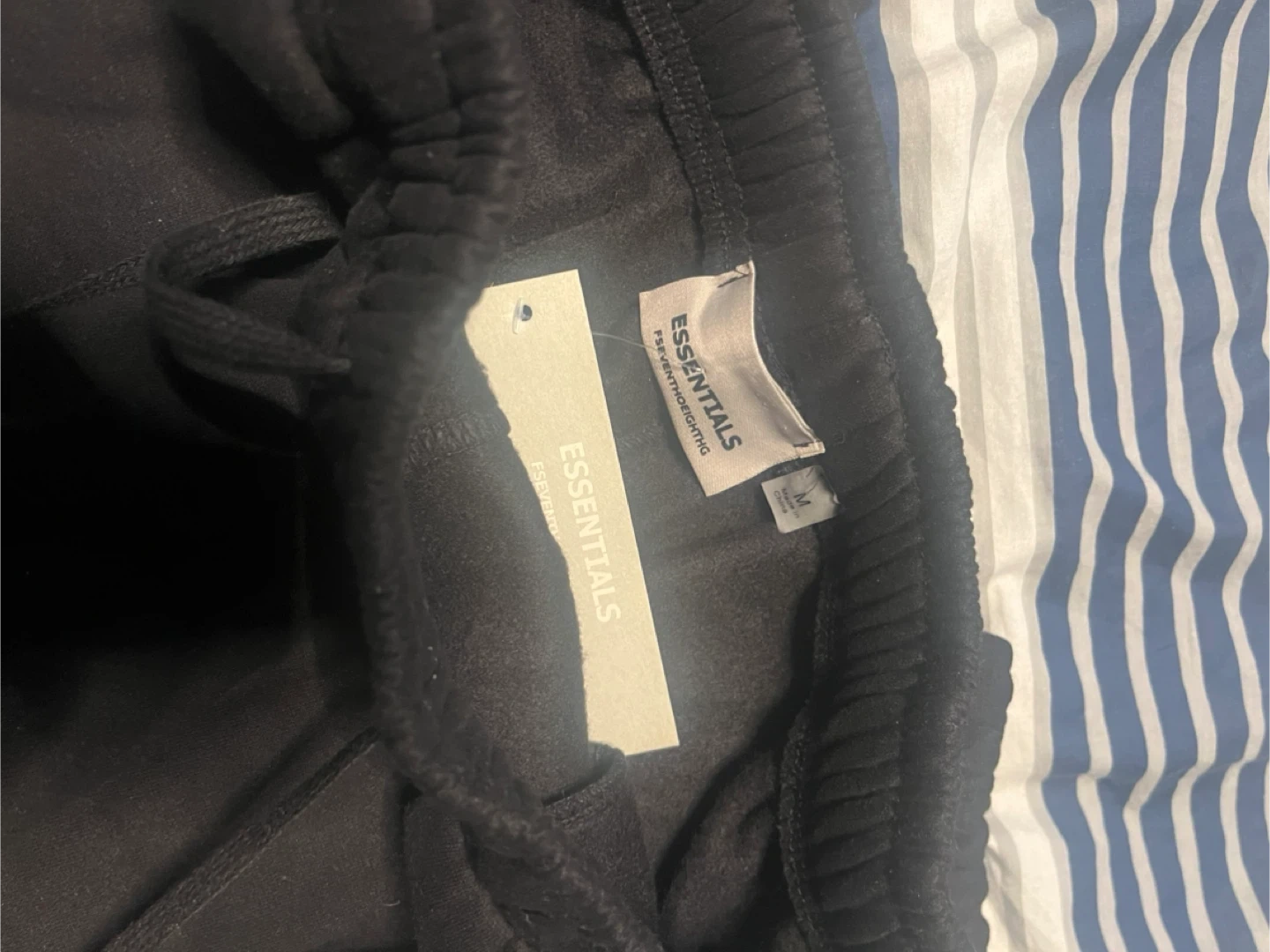These black sweatpants are from Fear of God Essentials. They are a size medium with an elastic waistband and drawstring. Made with a comfortable fabric blend.