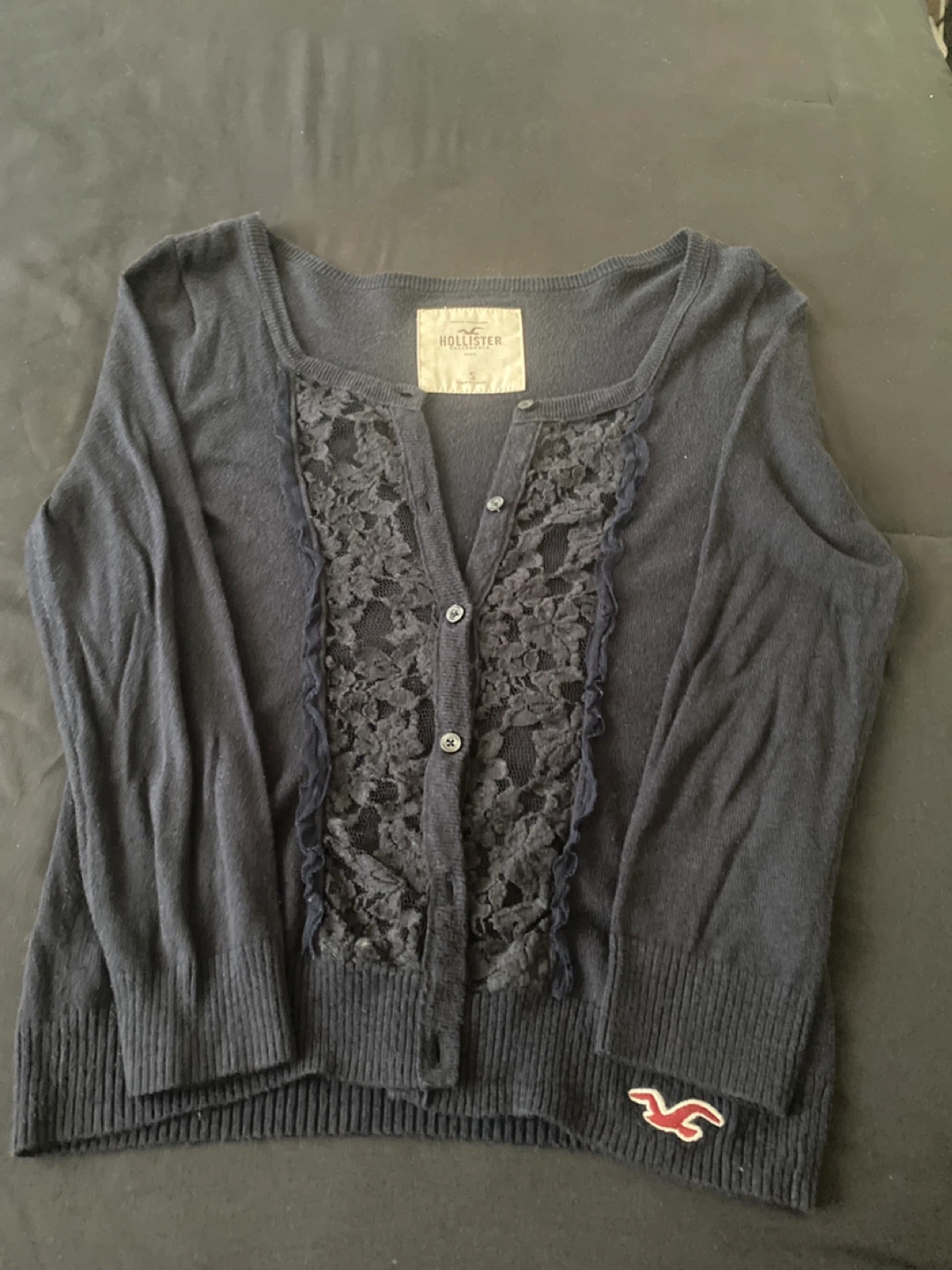 Hollister black cardigan with lace trim down the front. It's a size small. Buttons up the front.