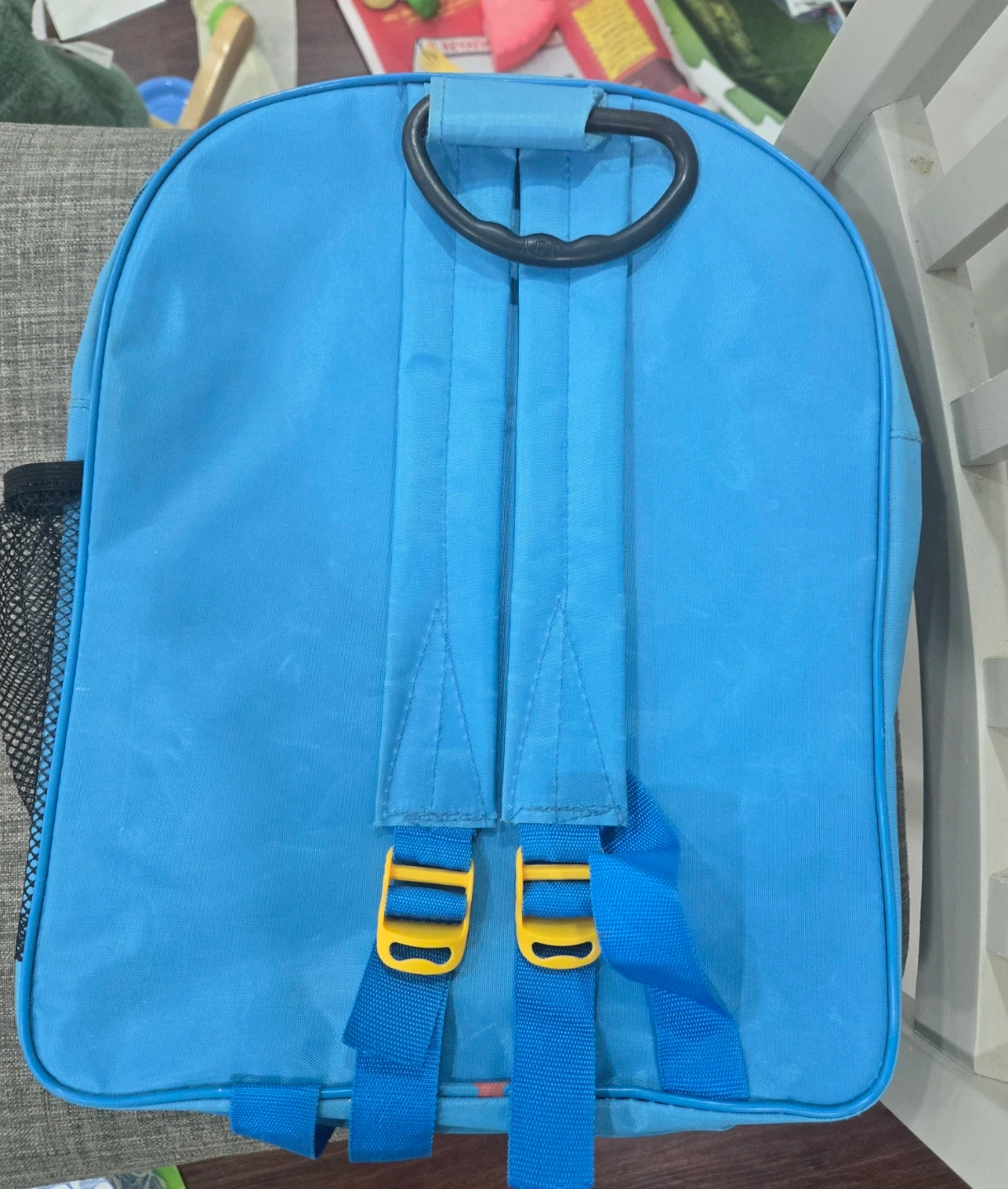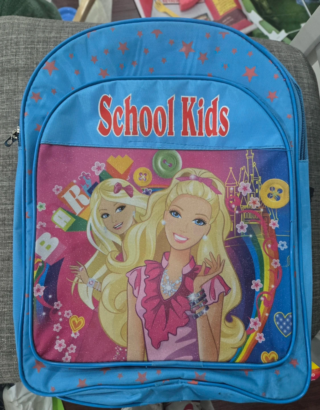 This bright blue backpack features Barbie and the words 'School Kids' printed on the front. It has adjustable straps and a side mesh pocket. It's perfect for carrying school supplies or essentials for a day out!