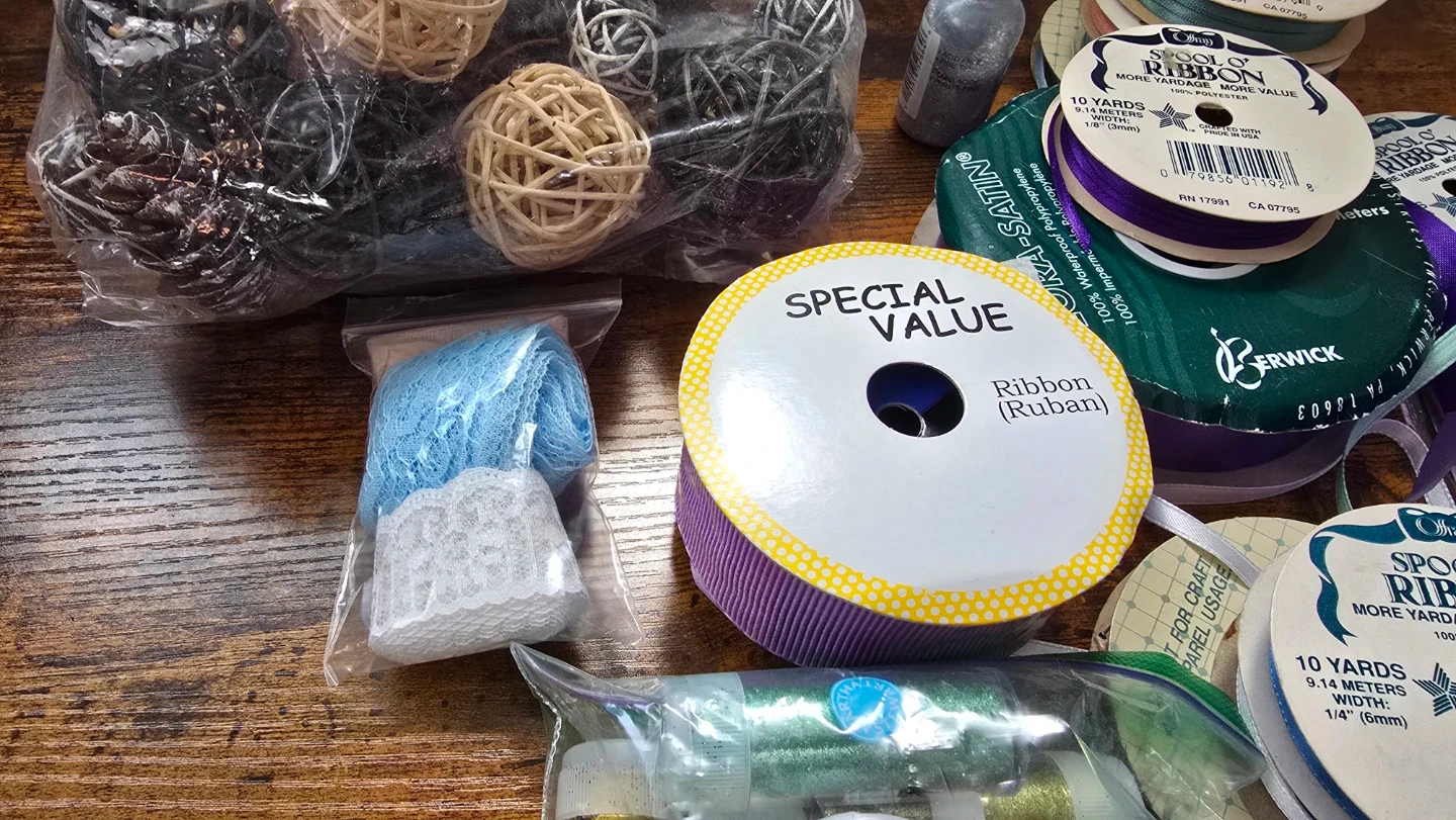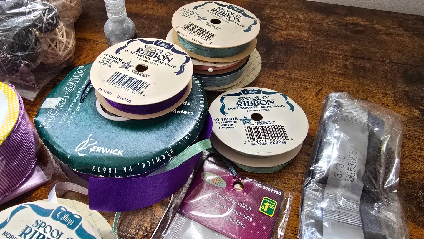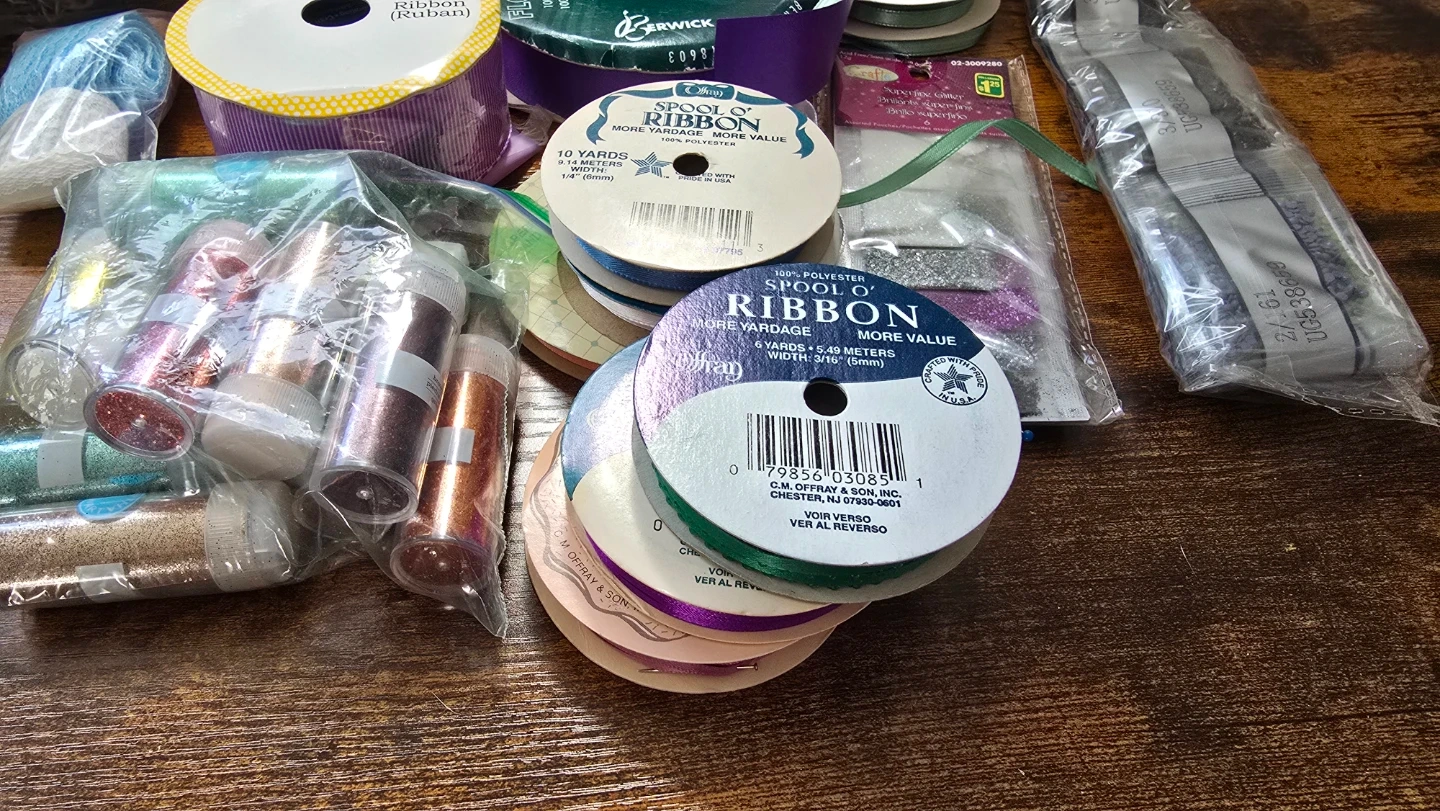 Craft supplies bundle featuring various ribbons and glitter tubes. Ribbons come on spools, some with "Spool O' Ribbon" branding. Includes glitter in assorted colours and textures. Perfect for various crafting projects!