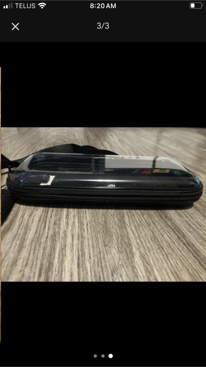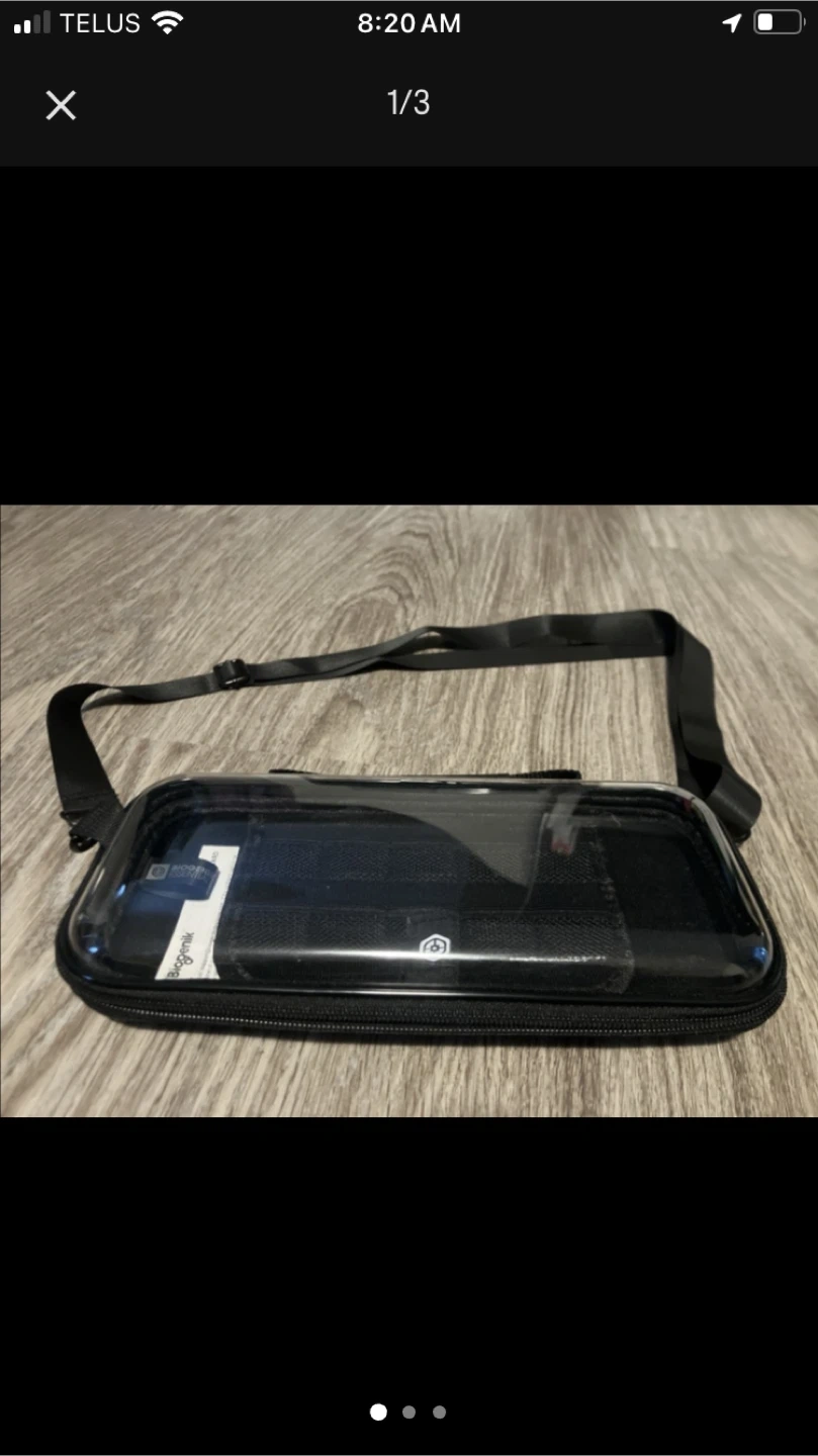 This is a clear Bagganik pouch with an adjustable strap. It zips closed and has a transparent top. It's useful for keeping small items organized and accessible.