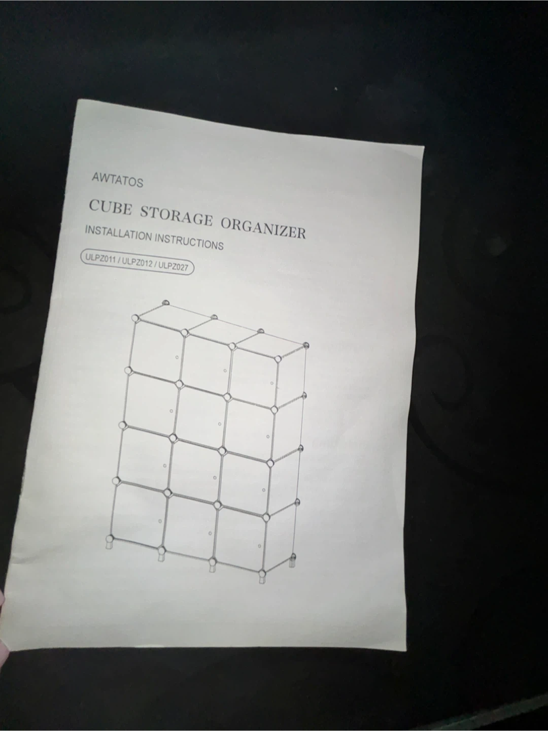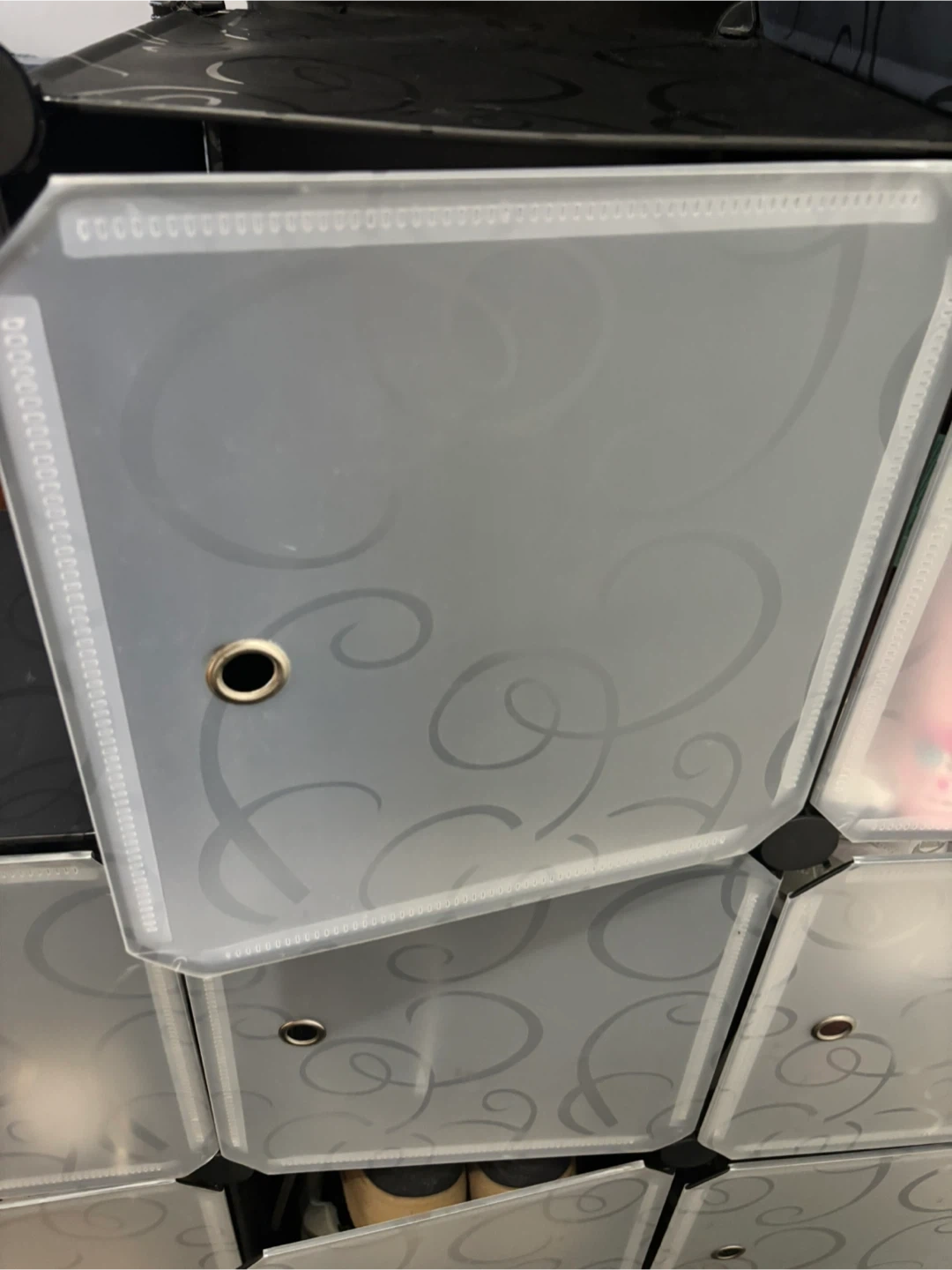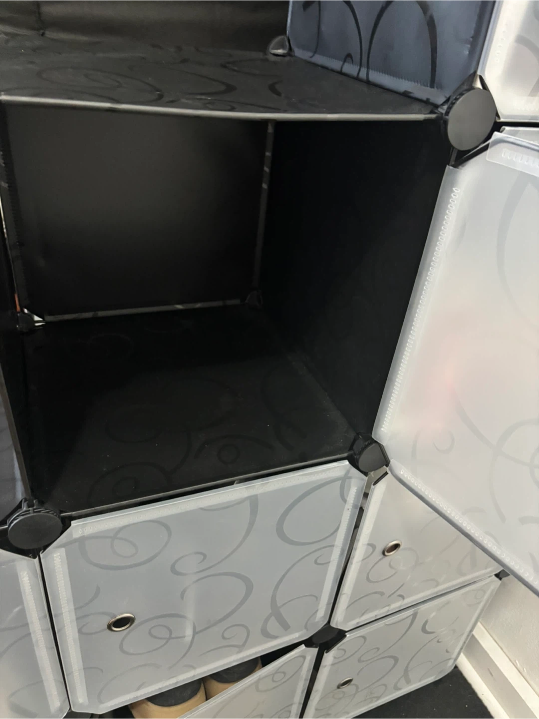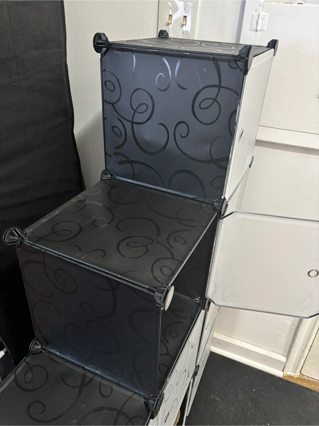 This AWTATOS cube storage organizer is perfect for storing shoes or other items. It has a stylish black swirl design. The organizer is made of plastic panels and connectors, ensuring durability and ease of cleaning.