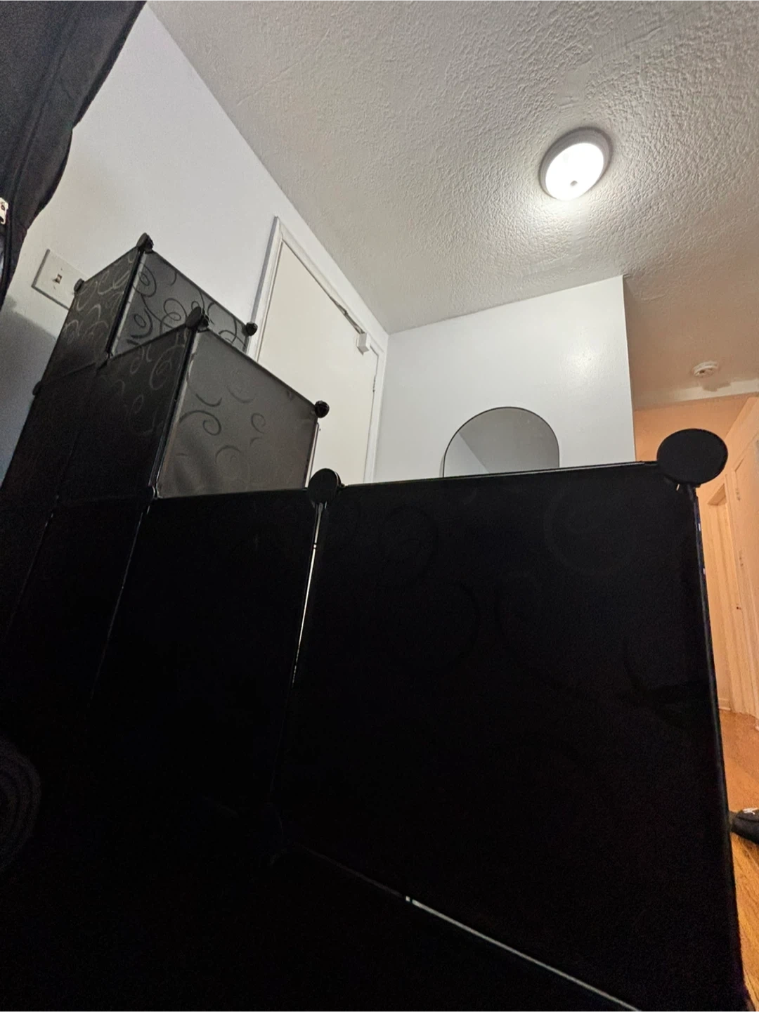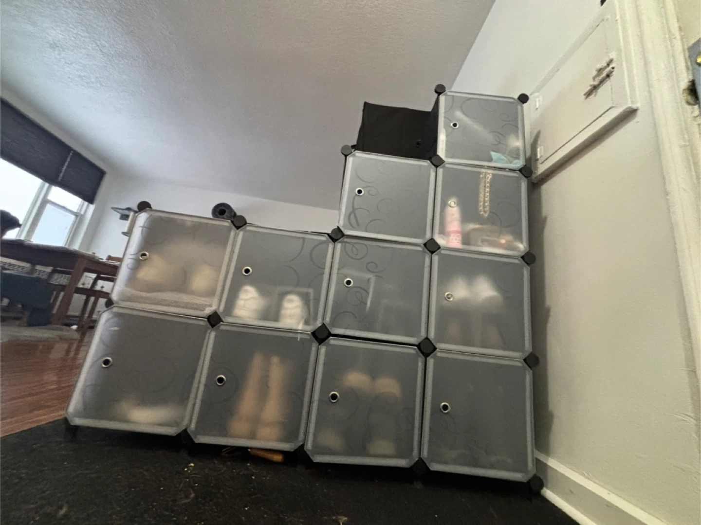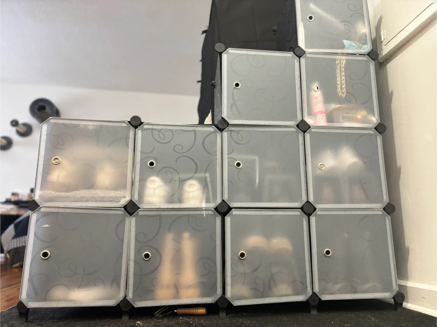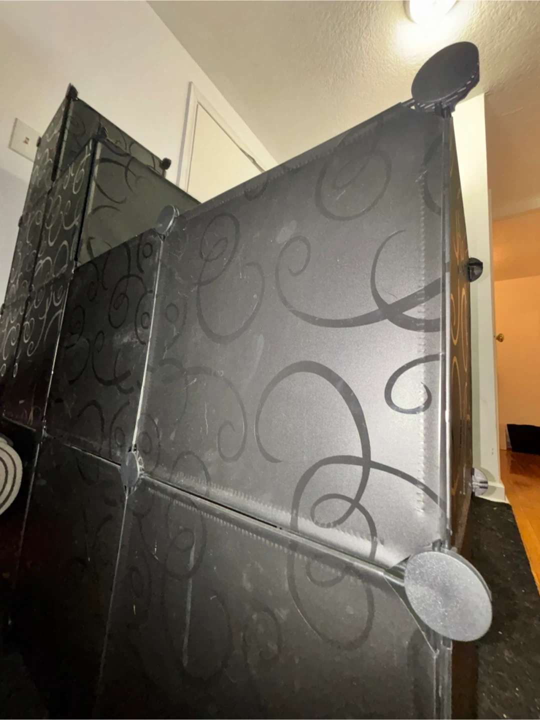 This AWTATOS cube storage organizer is perfect for storing shoes or other items. It has a stylish black swirl design. The organizer is made of plastic panels and connectors, ensuring durability and ease of cleaning.