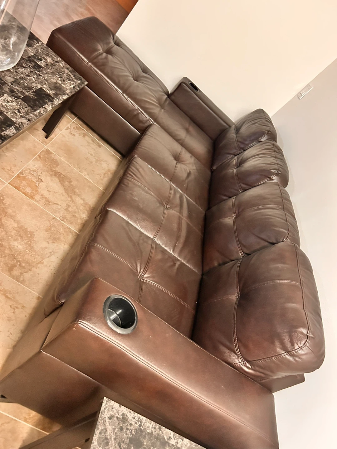 Comfortable brown leather reclining sofa with diamond tufting. It has built-in cup holders for convenience. This sofa is perfect for a home theatre or living room setup. It's a great addition for movie nights!