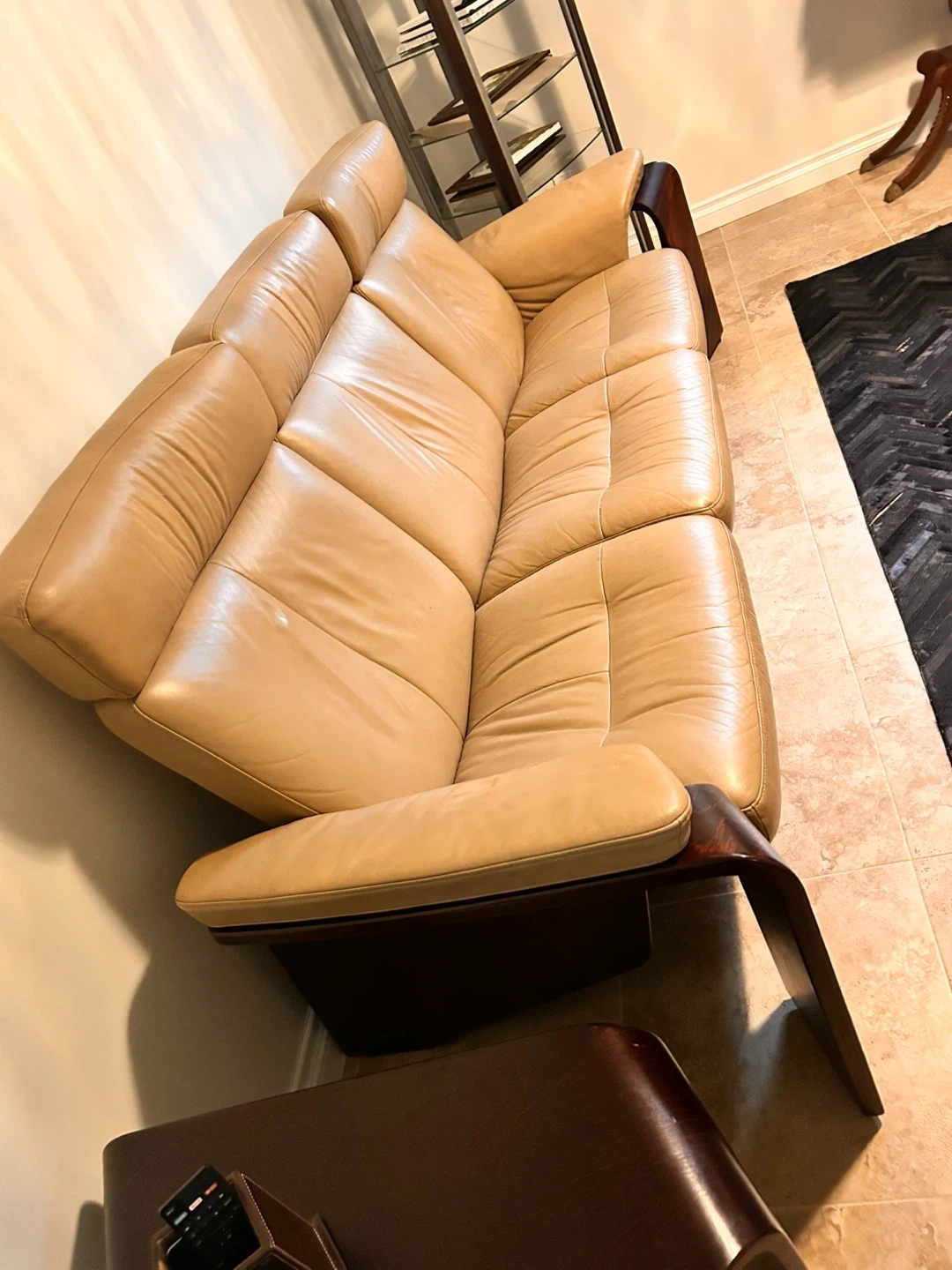 Classic tan leather sofa with curved wood accents. Comfortable two-seater design with adjustable headrests. It's a stylish piece for any living space.