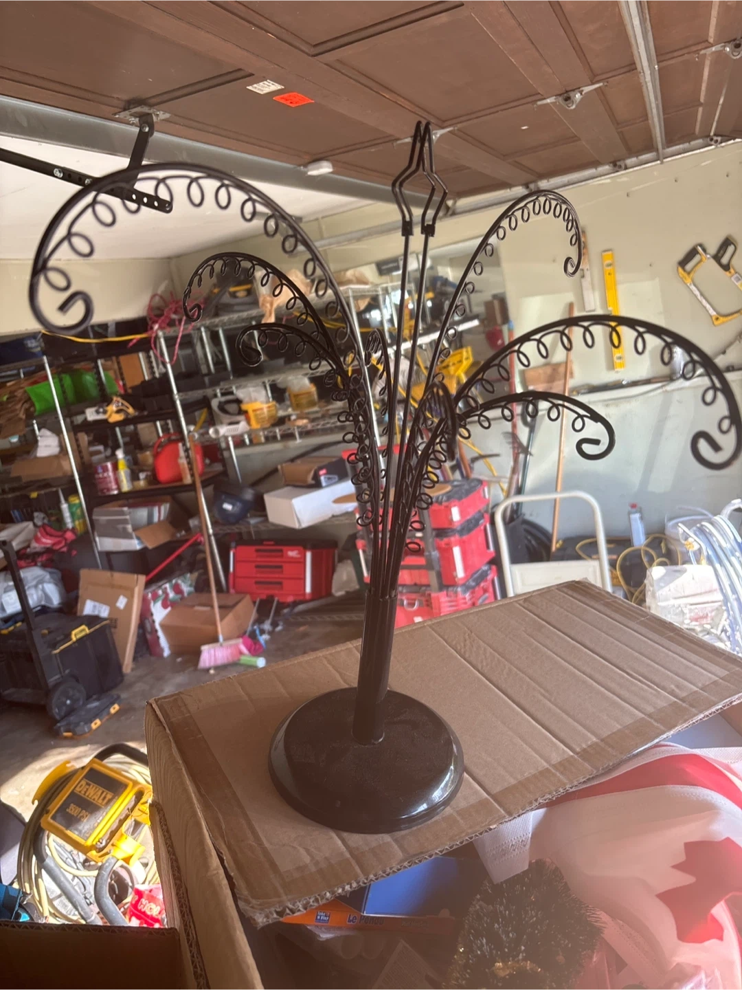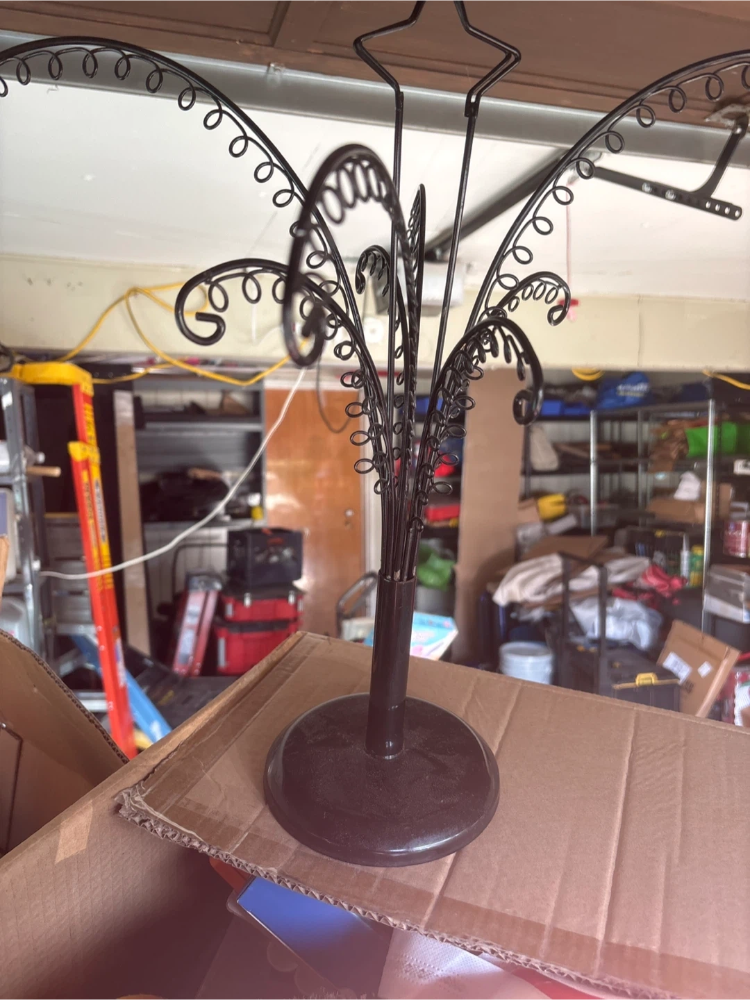 A black metal display stand with a circular base and decorative swirling arms. It's perfect for showcasing jewellery or small decorative items. This stand features multiple swirling arms for hanging accessories.