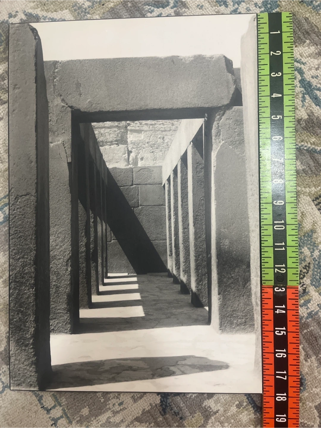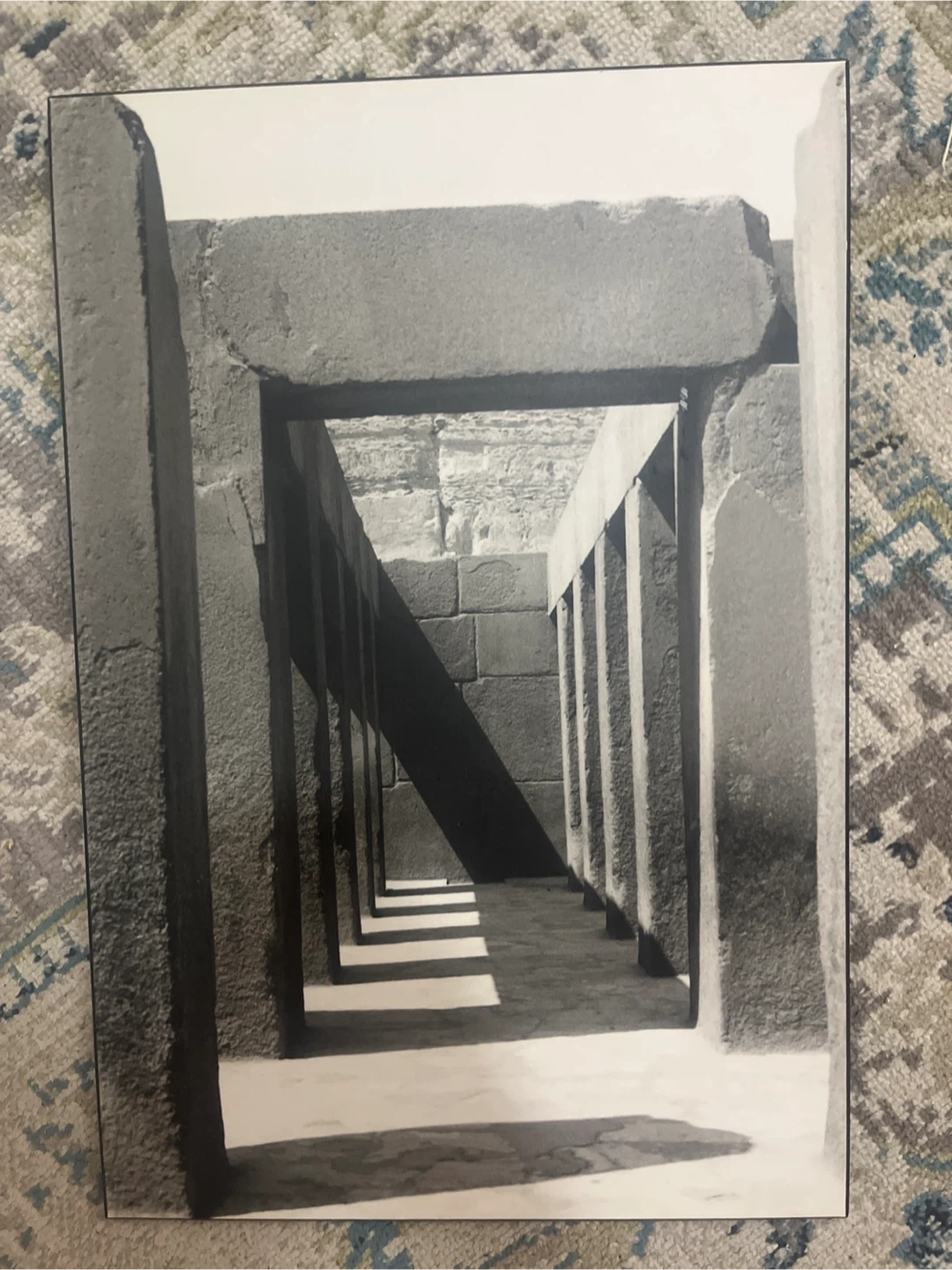 A black and white photograph showcasing architectural columns and stonework with dramatic shadows. It's mounted on a board with a hanging slot. This piece would suit a space looking for a touch of classic design.