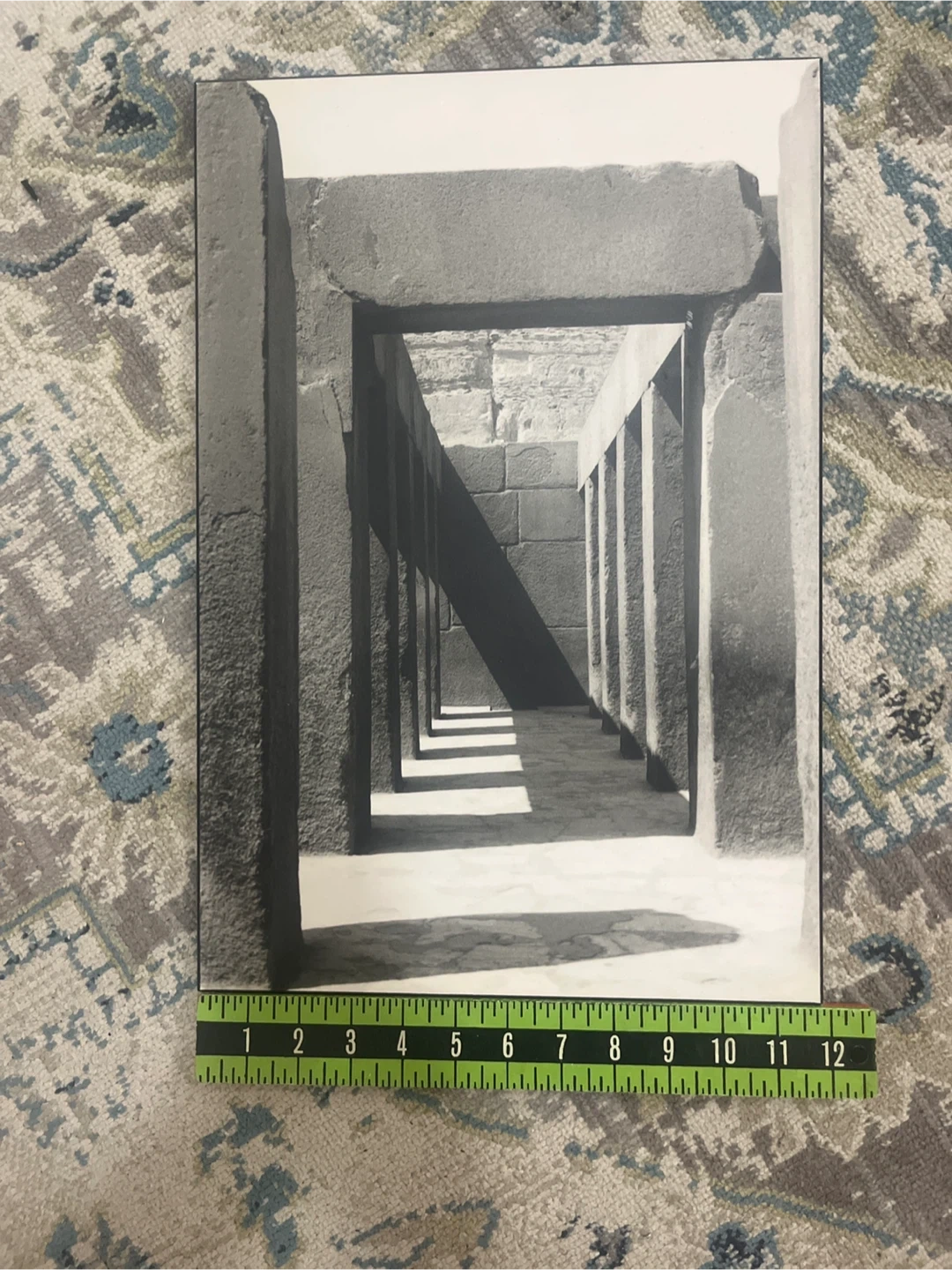 A black and white photograph showcasing architectural columns and stonework with dramatic shadows. It's mounted on a board with a hanging slot. This piece would suit a space looking for a touch of classic design.