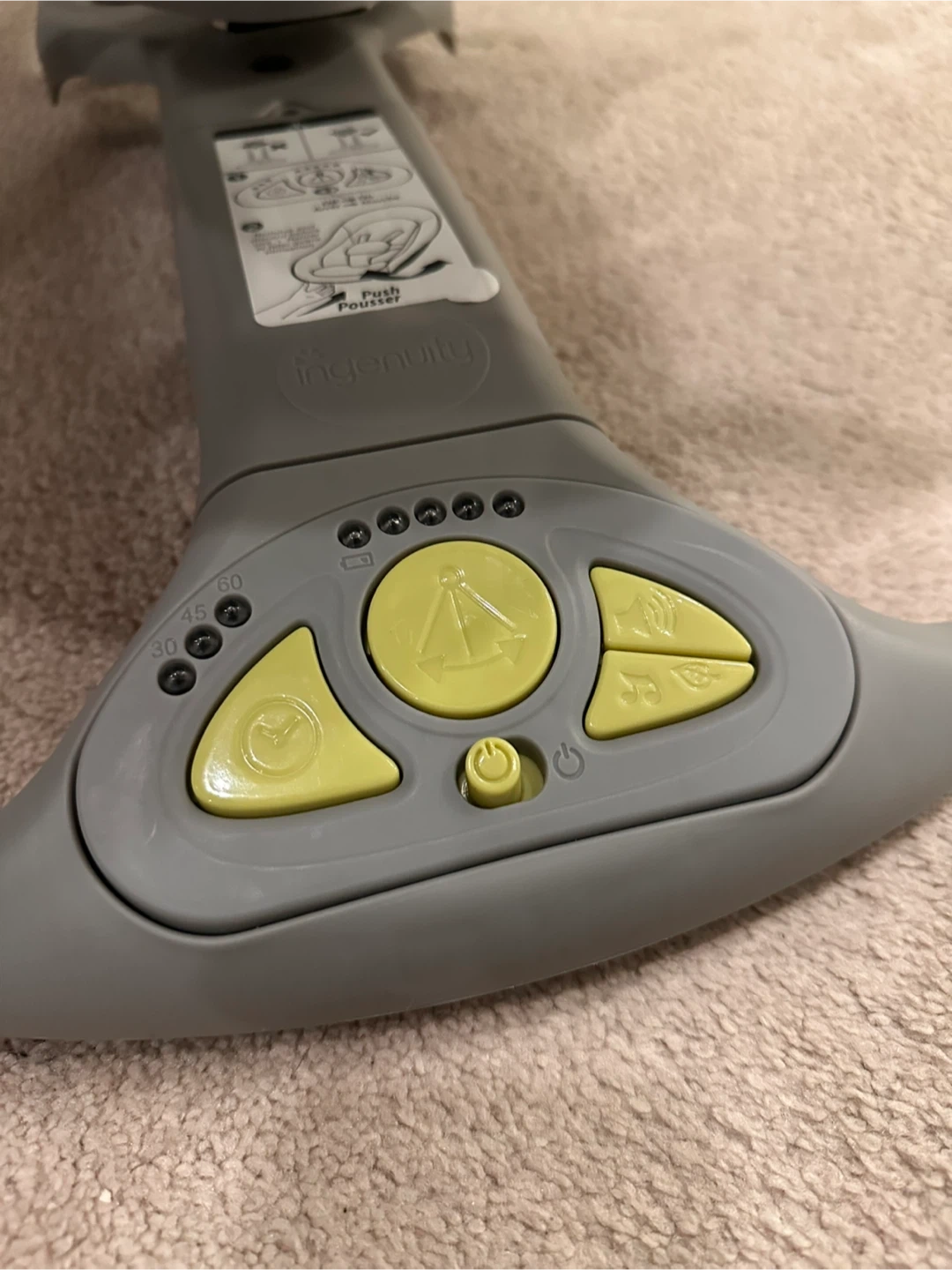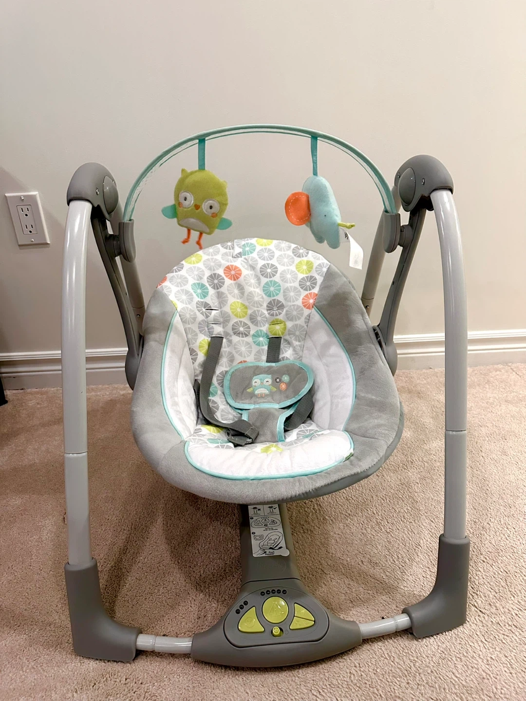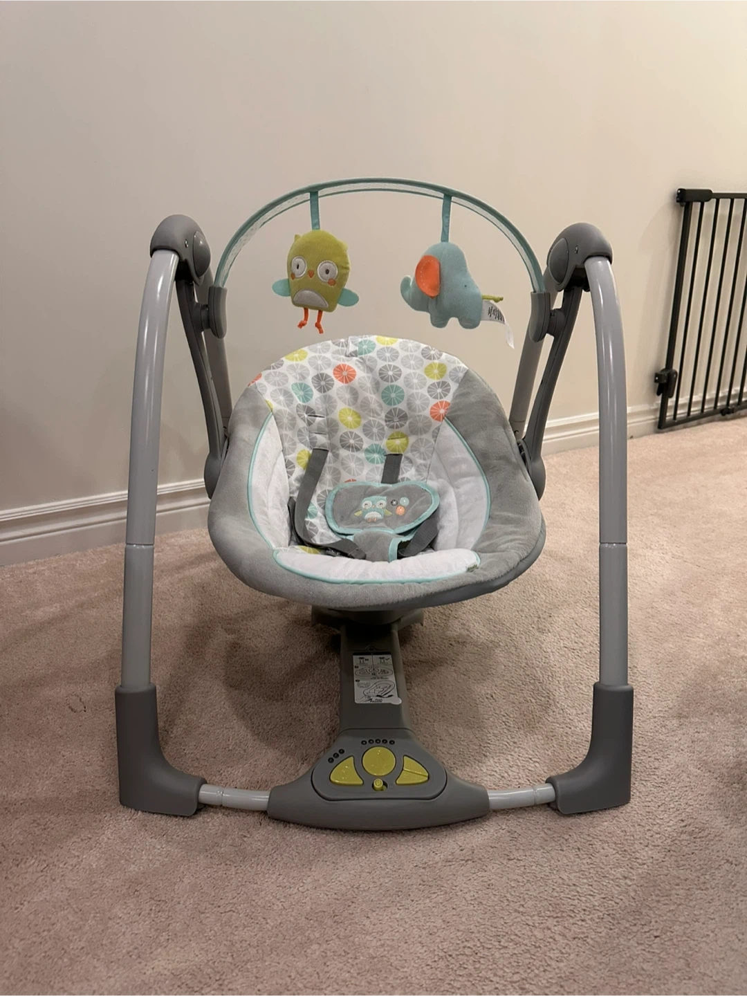 Ingenuity baby swing in grey with owl and animal pattern. Features multiple timer settings and music options. It's a great option for soothing little ones!