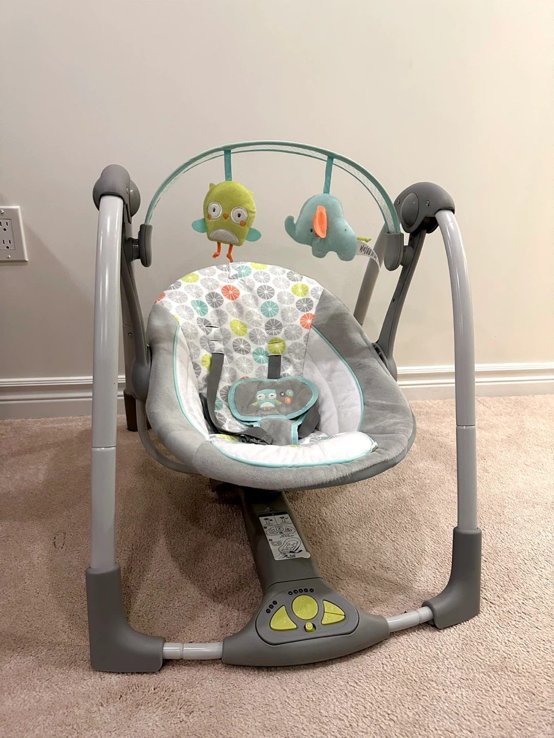 Ingenuity baby swing in grey with owl and animal pattern. Features multiple timer settings and music options. It's a great option for soothing little ones!