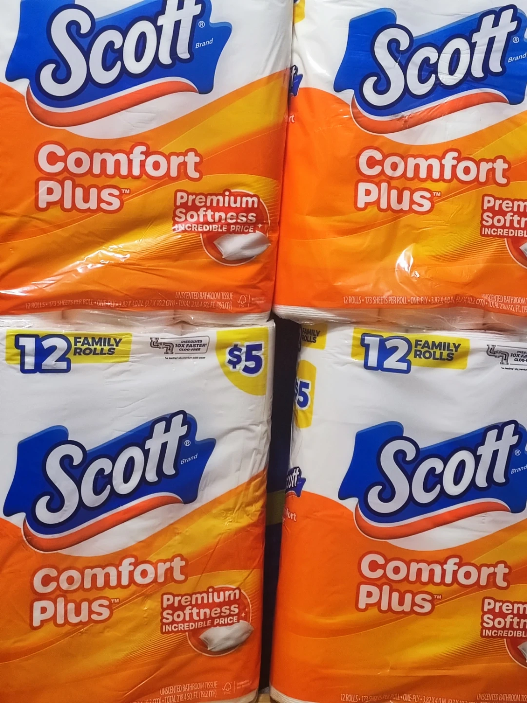 4-pack Scott Comfort Plus toilet paper offers premium softness and is unscented. Each package contains 12 family-sized rolls. It's made with one-ply sheets.