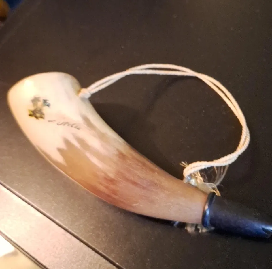 This decorative horn features a painted nautical scene and a hanging cord. It's made from natural horn with a dark cap. A unique piece for display!