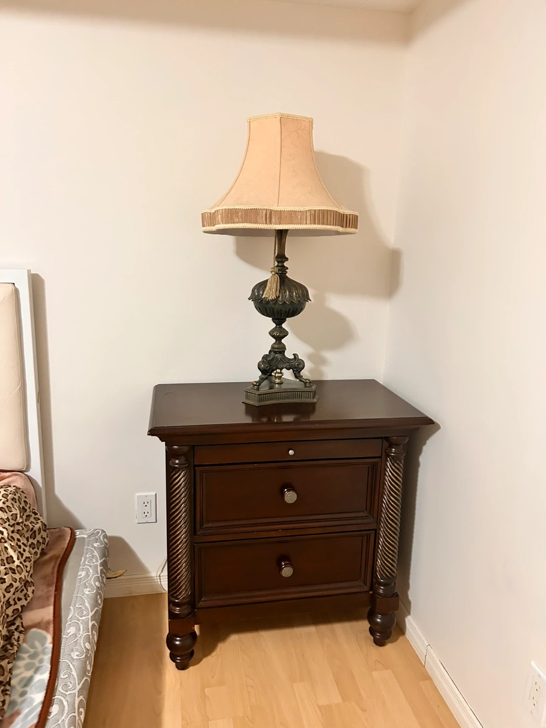 Dark wood dresser with six drawers and a matching nightstand with two drawers. Features ornate carved details and metal hardware. Perfect for bedroom storage!