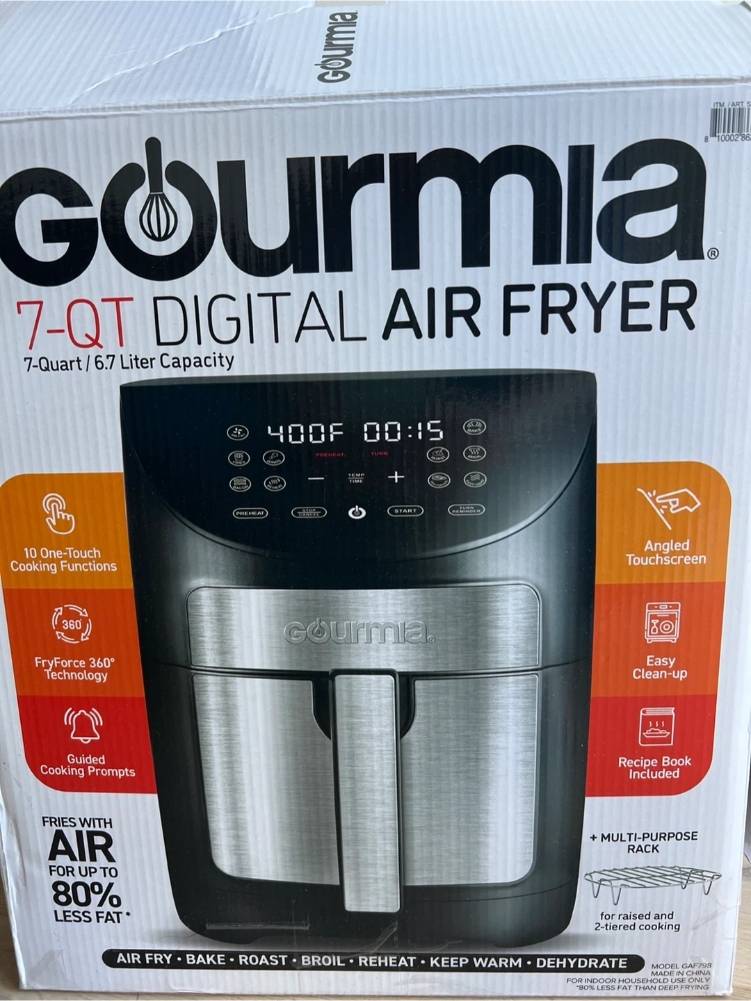 This is a Gourmia 7-quart digital air fryer with 10 one-touch cooking functions. It features FryForce 360° Technology and an angled touchscreen. Includes a recipe book and multi-purpose rack.