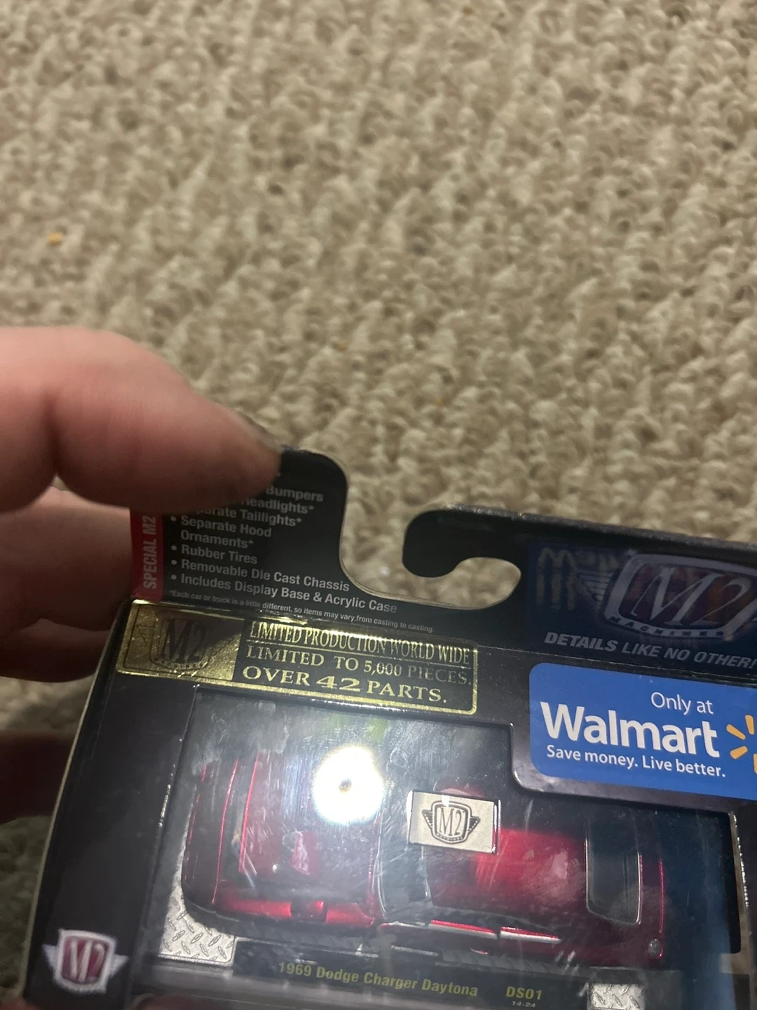 This is a M2 Machines 1969 Dodge Charger Daytona die cast car. It's a limited production world wide item, limited to 5,000 pieces. It features a die cast body, opening doors, separate bumpers, separate headlights, separate taillights, separate hood ornaments, and rubber tires. It also includes a removable die cast chassis and a display base and acrylic case. This car is 1 of 5000 produced!