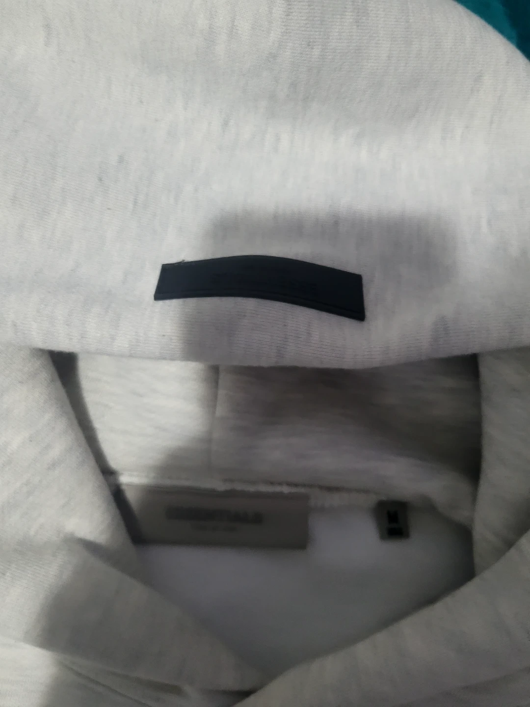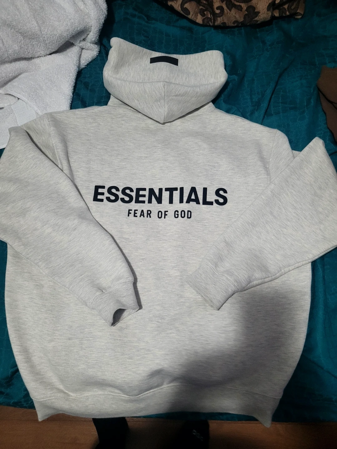 This is an ESSENTIALS Fear of God hoodie in heather grey. It's a size medium and made from a soft fleece material. This hoodie is great for everyday wear.