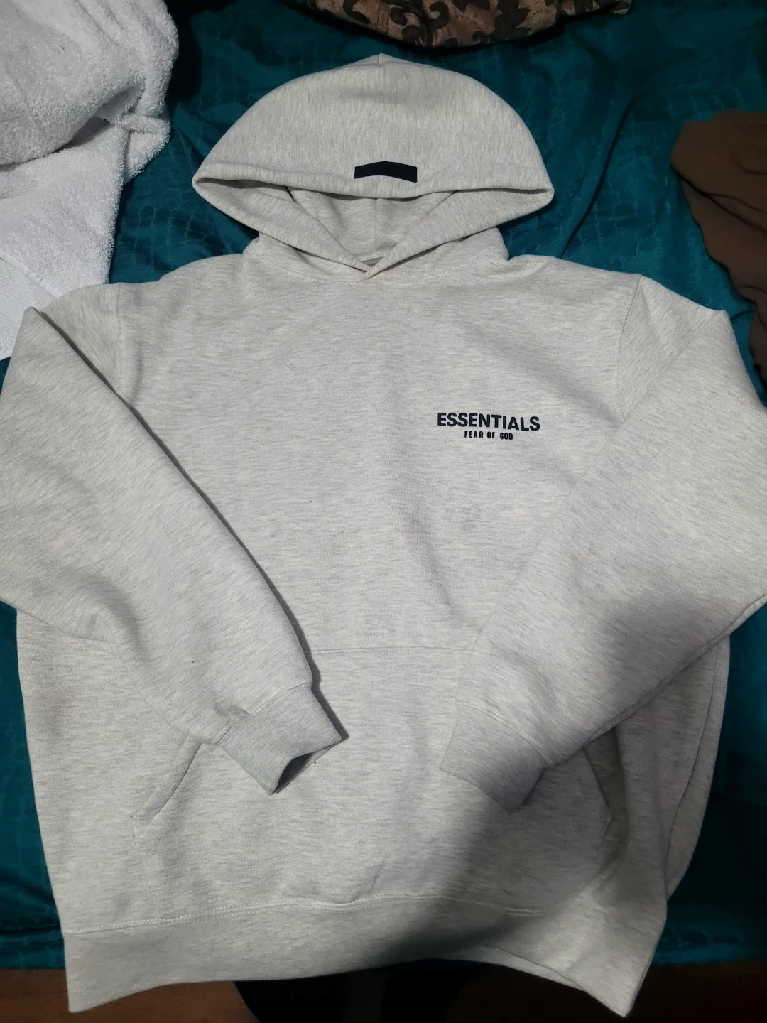 This is an ESSENTIALS Fear of God hoodie in heather grey. It's a size medium and made from a soft fleece material. This hoodie is great for everyday wear.