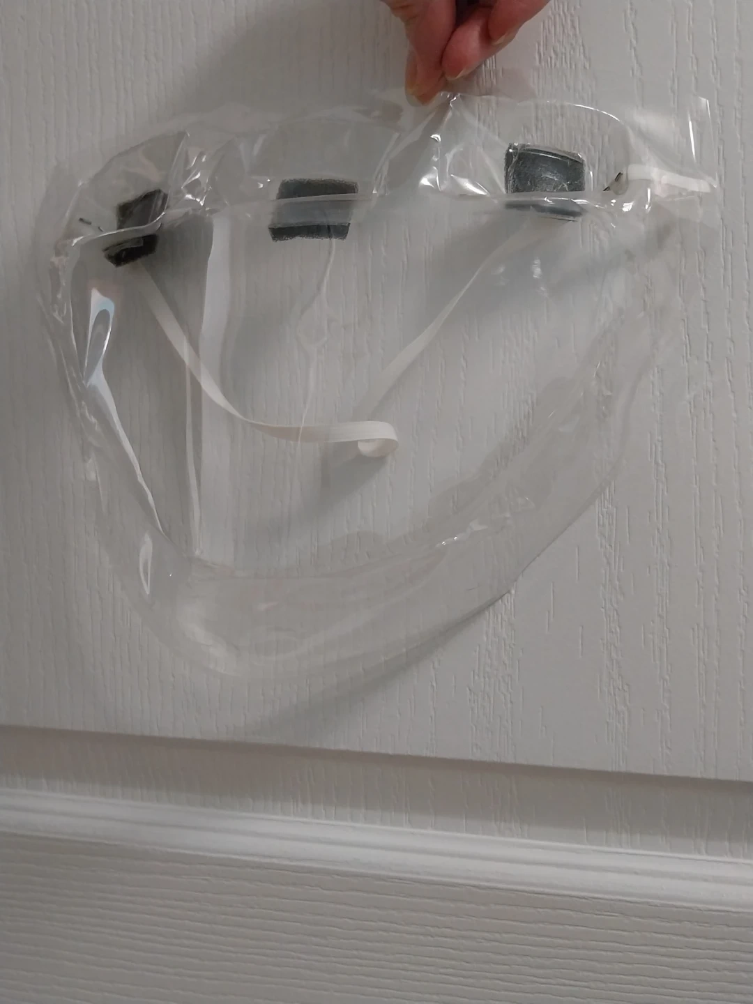 This is a clear face shield designed for protection. It features a foam forehead pad and an adjustable elastic band for a comfortable fit. Protect your face from splashes, debris, or other external factors.
