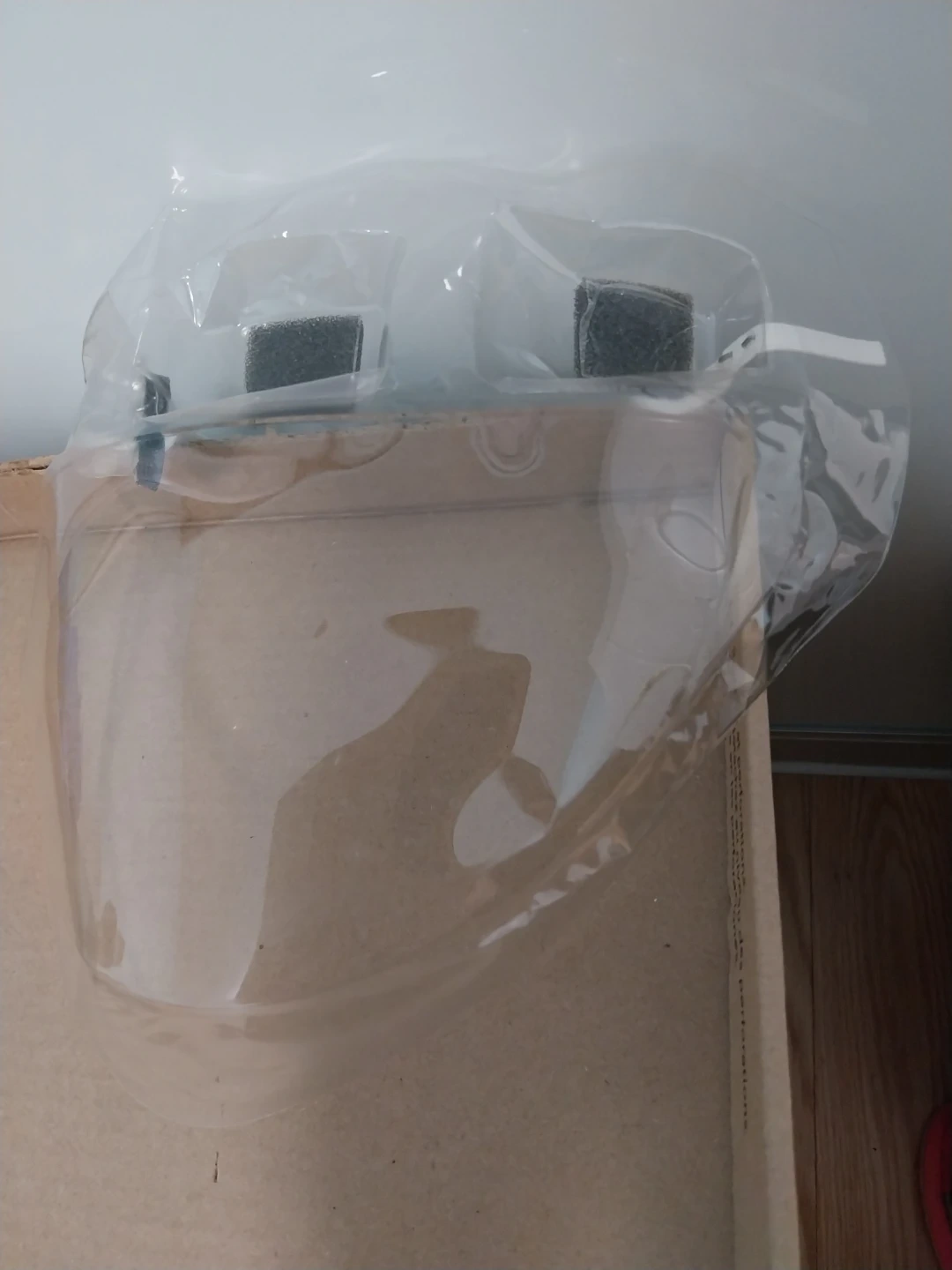 This is a clear face shield designed for protection. It features a foam forehead pad and an adjustable elastic band for a comfortable fit. Protect your face from splashes, debris, or other external factors.