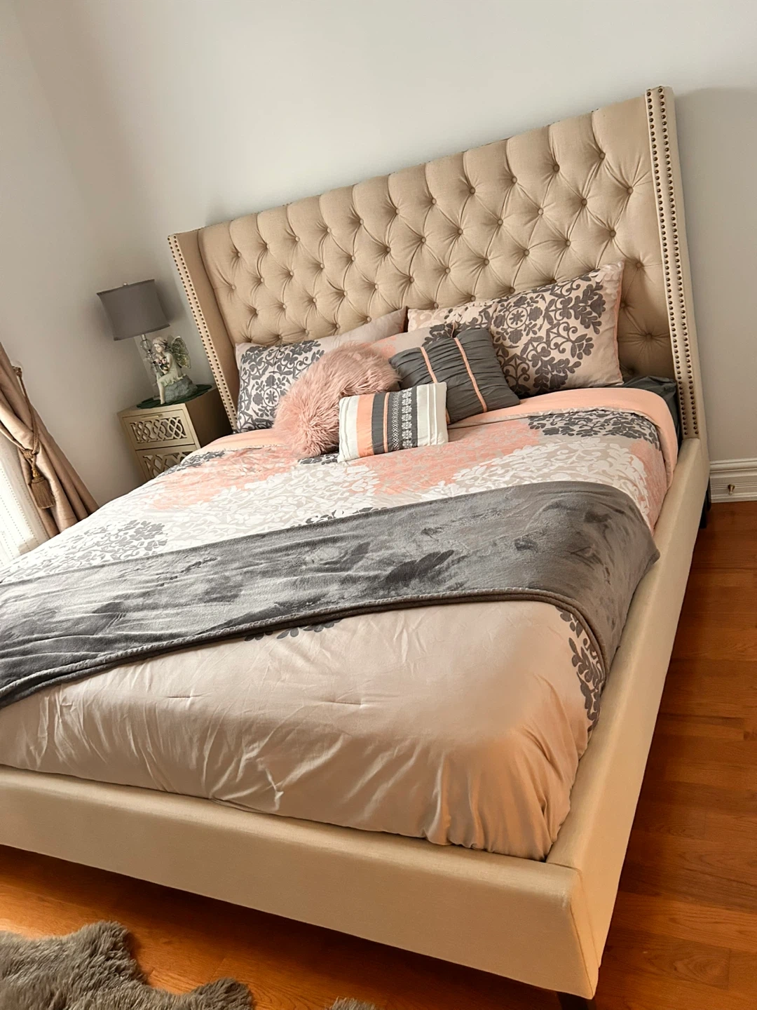 Elegant tufted wingback king size bed frame in a neutral beige fabric. Adds a touch of sophistication to any bedroom. Sturdy construction with a low profile base. Also including brand new mattress