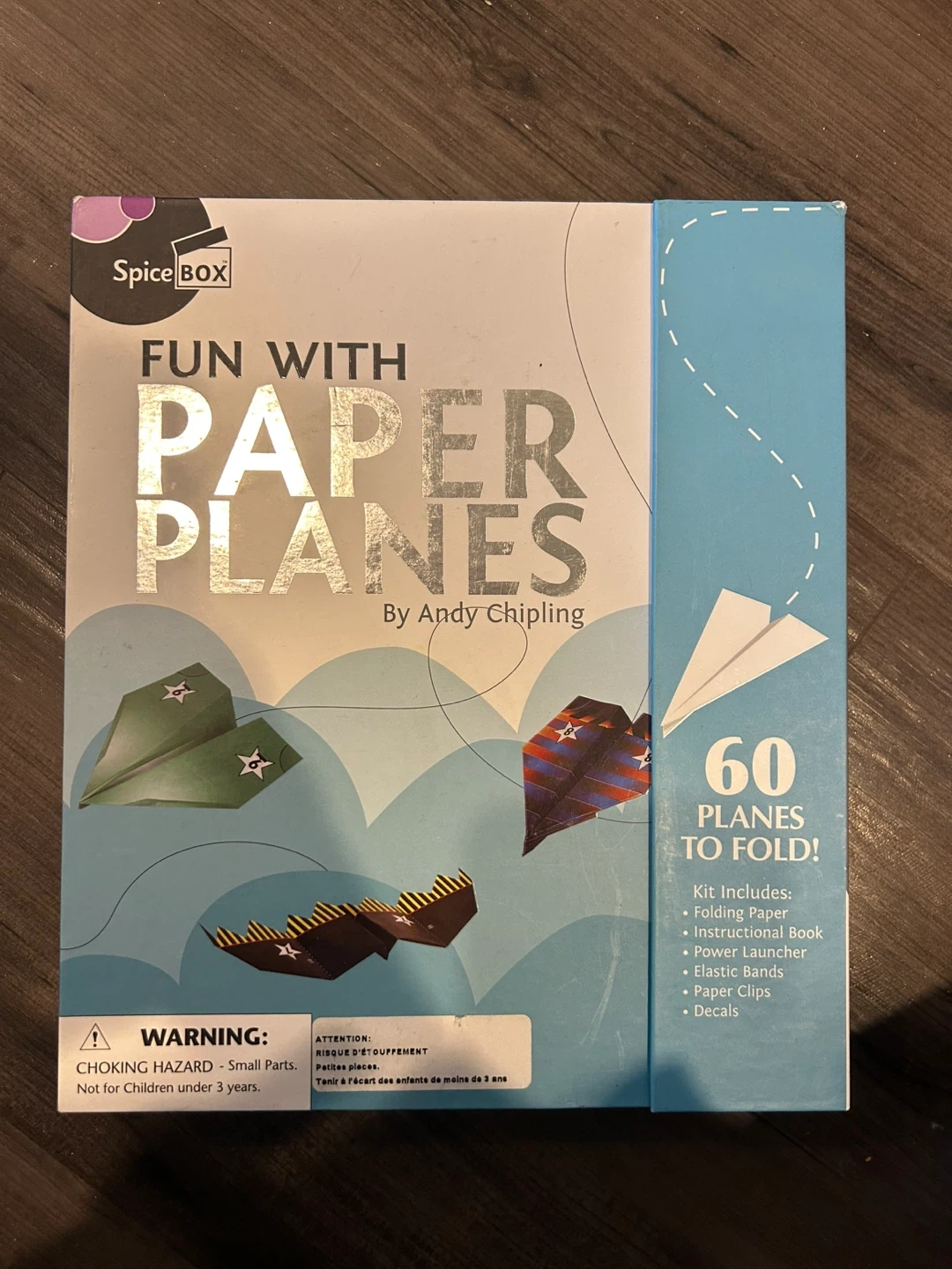 This Spice Box kit lets you fold 60 paper planes. It includes folding paper, an instructional book, a power launcher, elastic bands, paper clips, and decals.