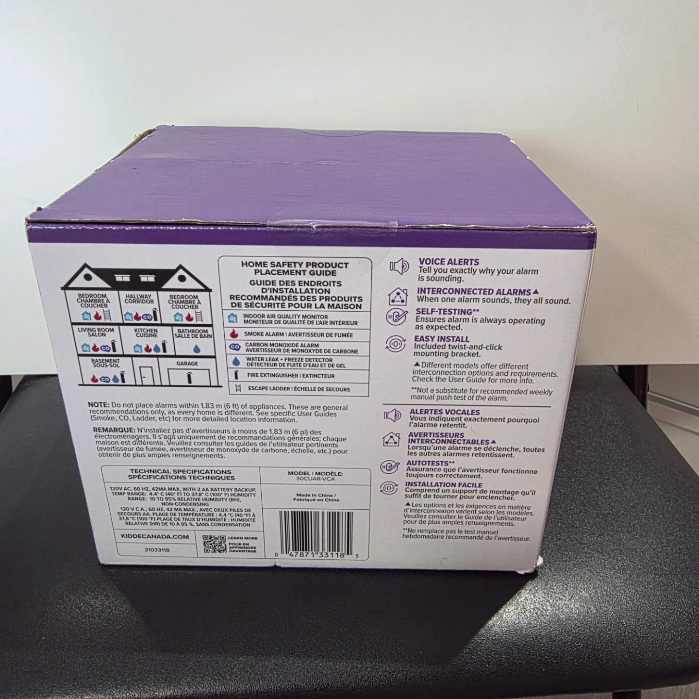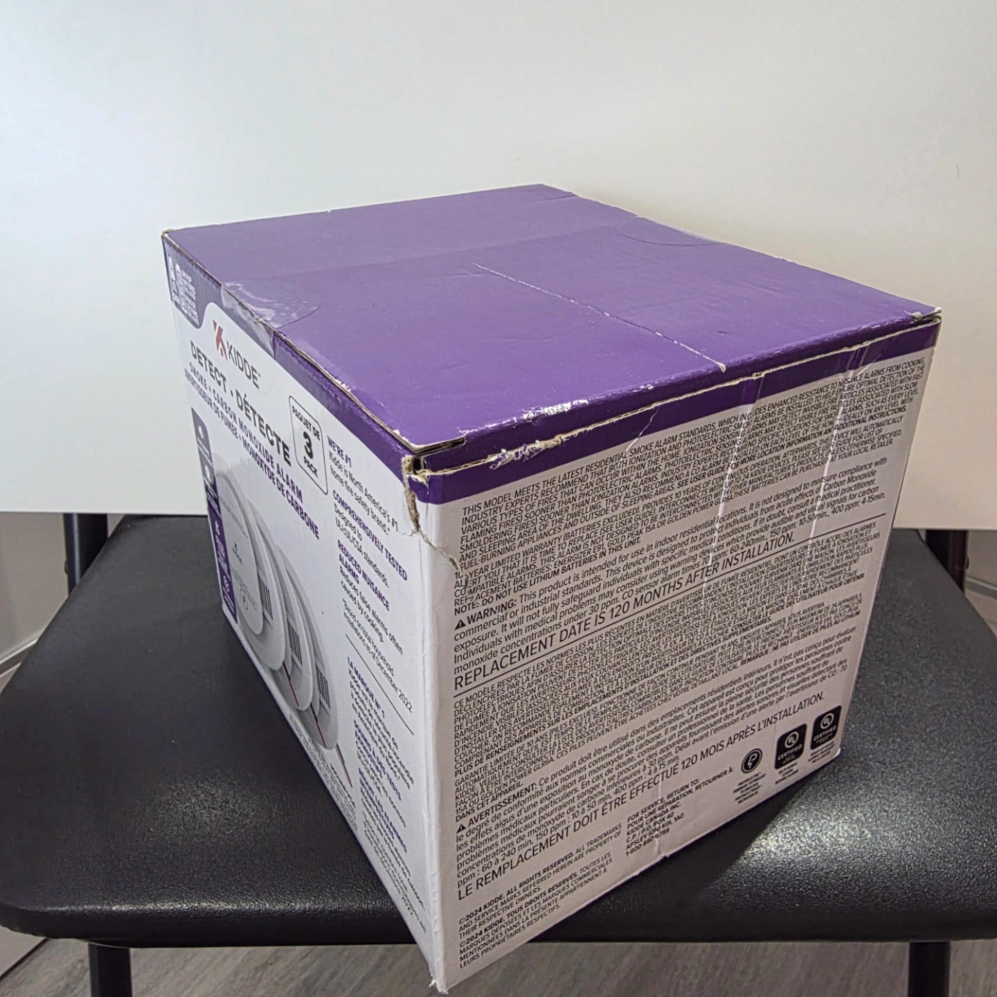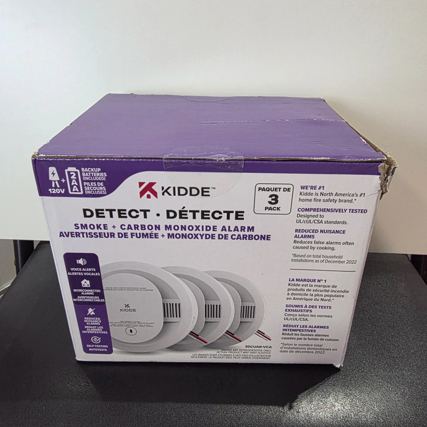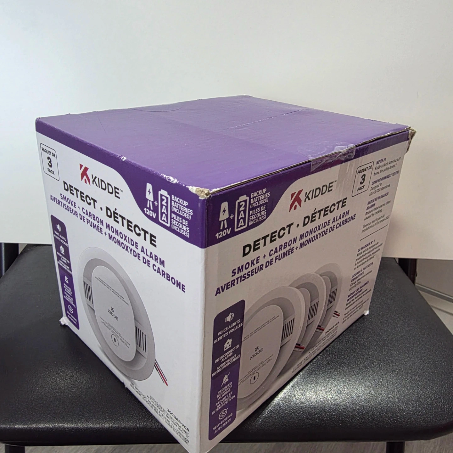 This is a 3-pack of Kidde smoke and carbon monoxide alarms. Each alarm runs on 120V power with a 2 AA battery backup, and includes batteries. Designed to meet UL/CSA standards, these alarms offer voice alerts and interconnected capabilities. The replacement date on the box is December 2022.