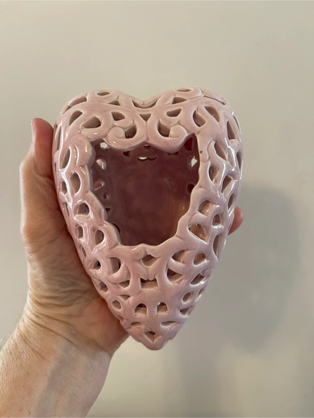 This pretty pink ceramic piece has a delicate lace-like pattern. It's shaped like a heart and's perfect for holding a small candle or flowers. This would be a lovely addition to any room on a table or on the wall. Great Valentine gift!