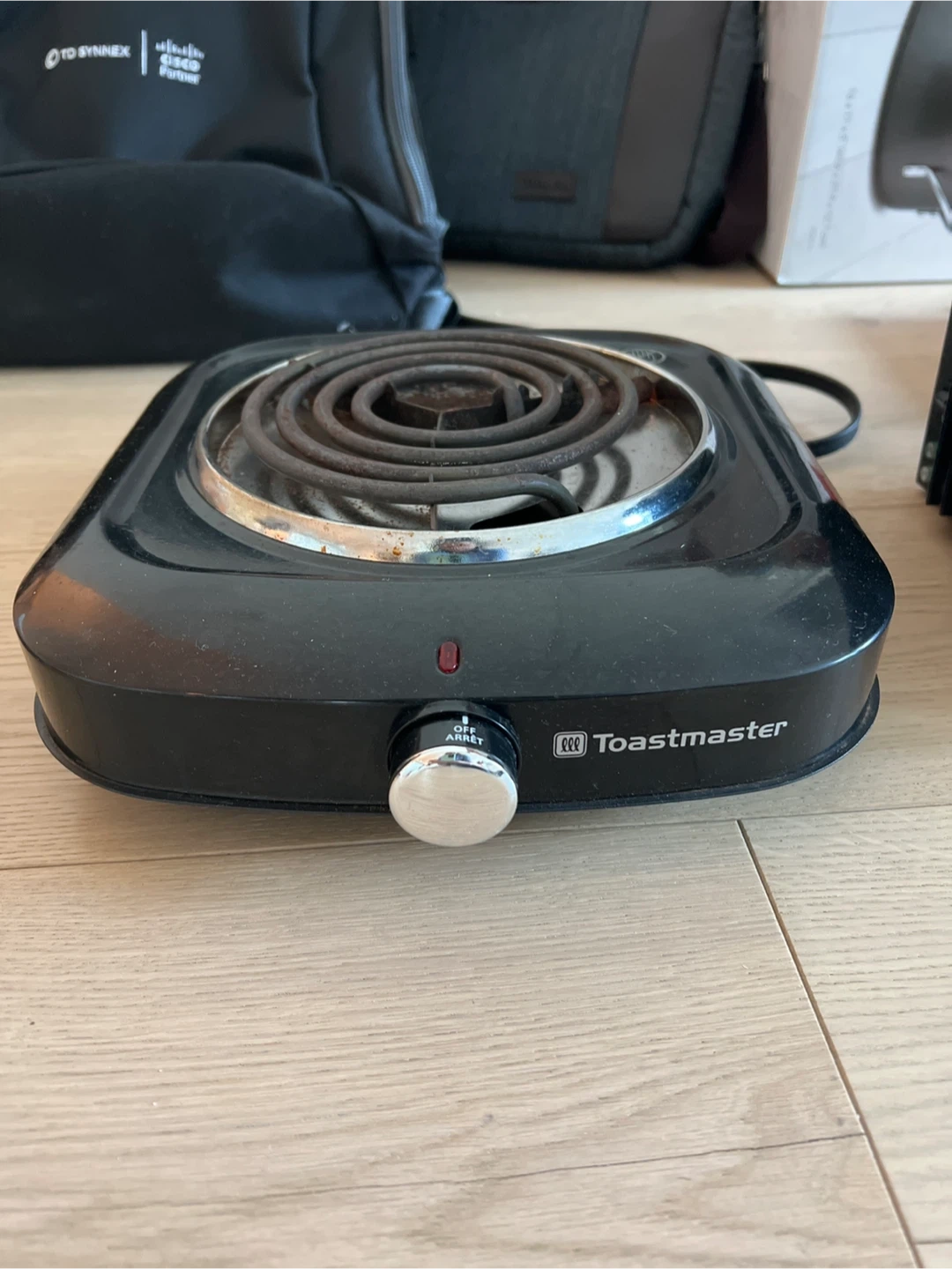 Toastmaster single electric burner. Features a coil heating element and adjustable temperature control. It's a handy hot plate for small kitchens or dorm rooms.