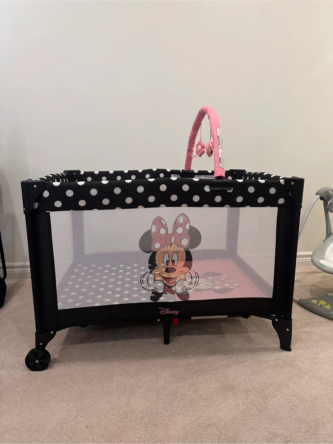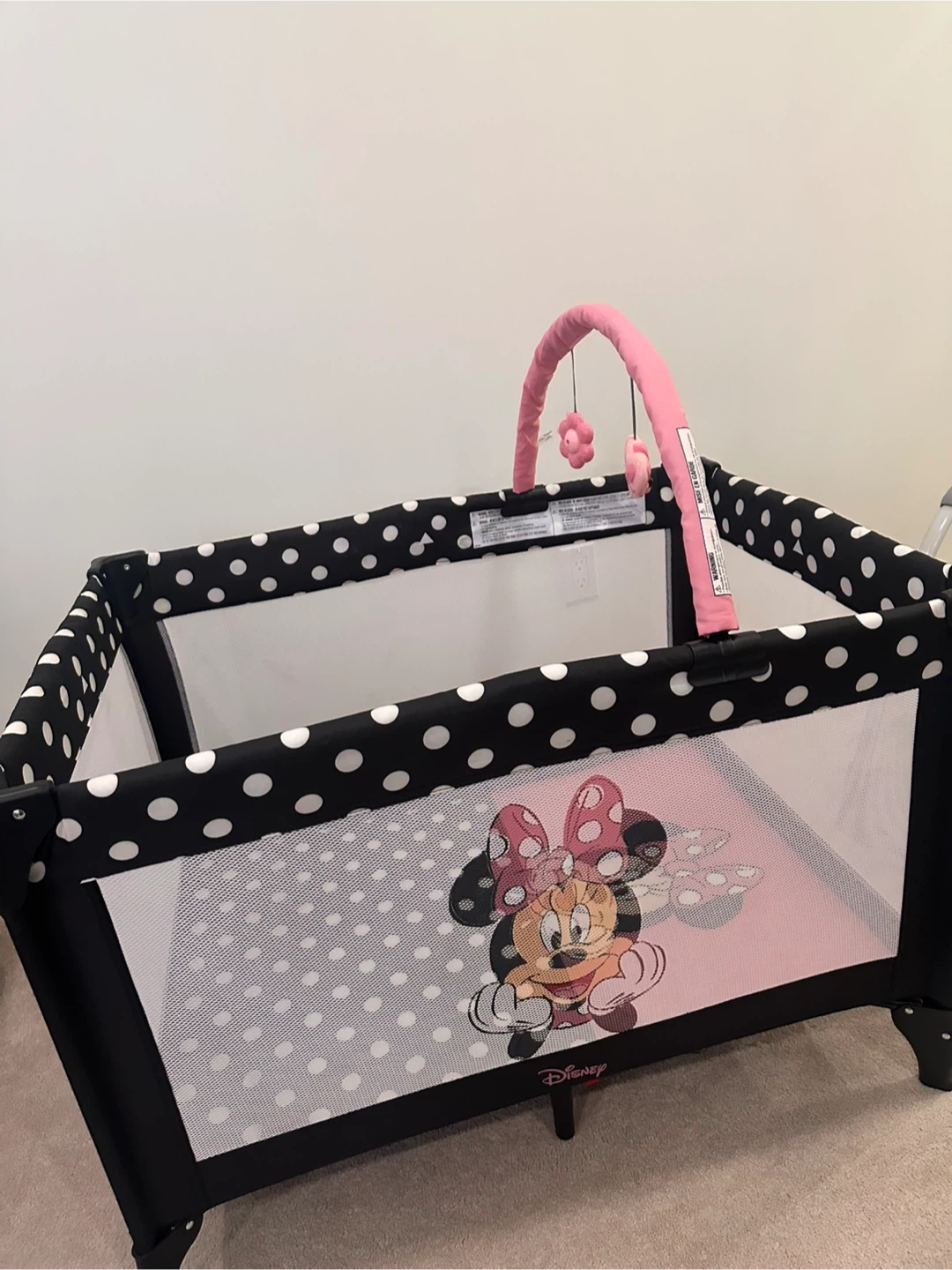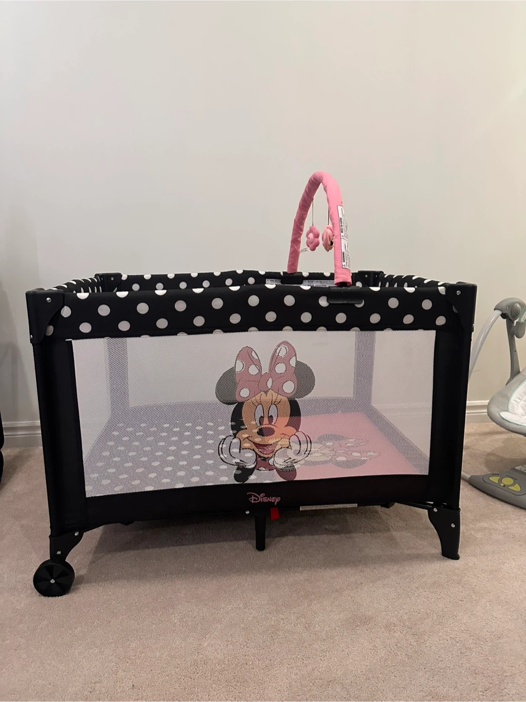 Full price 135, pay 90 - almost brand new. A black and white polka dot playpen featuring Minnie Mouse. It includes a removable mobile with plush toys.