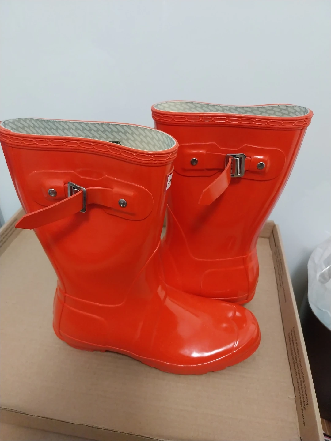 Hunter Original Gloss Short rain boots in a Orange-Red colour. These boots are made from natural rubber. They feature adjustable buckles on the side. Perfect for wet weather days!
