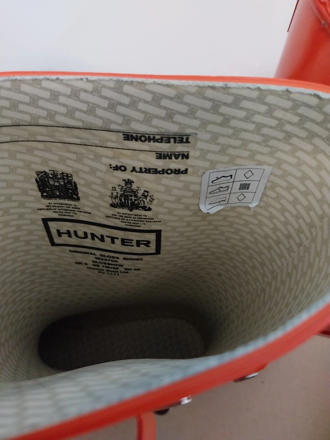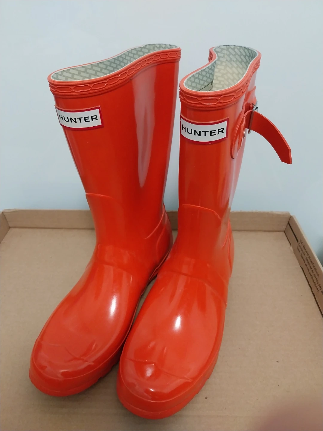 Hunter Original Gloss Short rain boots in a Orange-Red colour. These boots are made from natural rubber. They feature adjustable buckles on the side. Perfect for wet weather days!