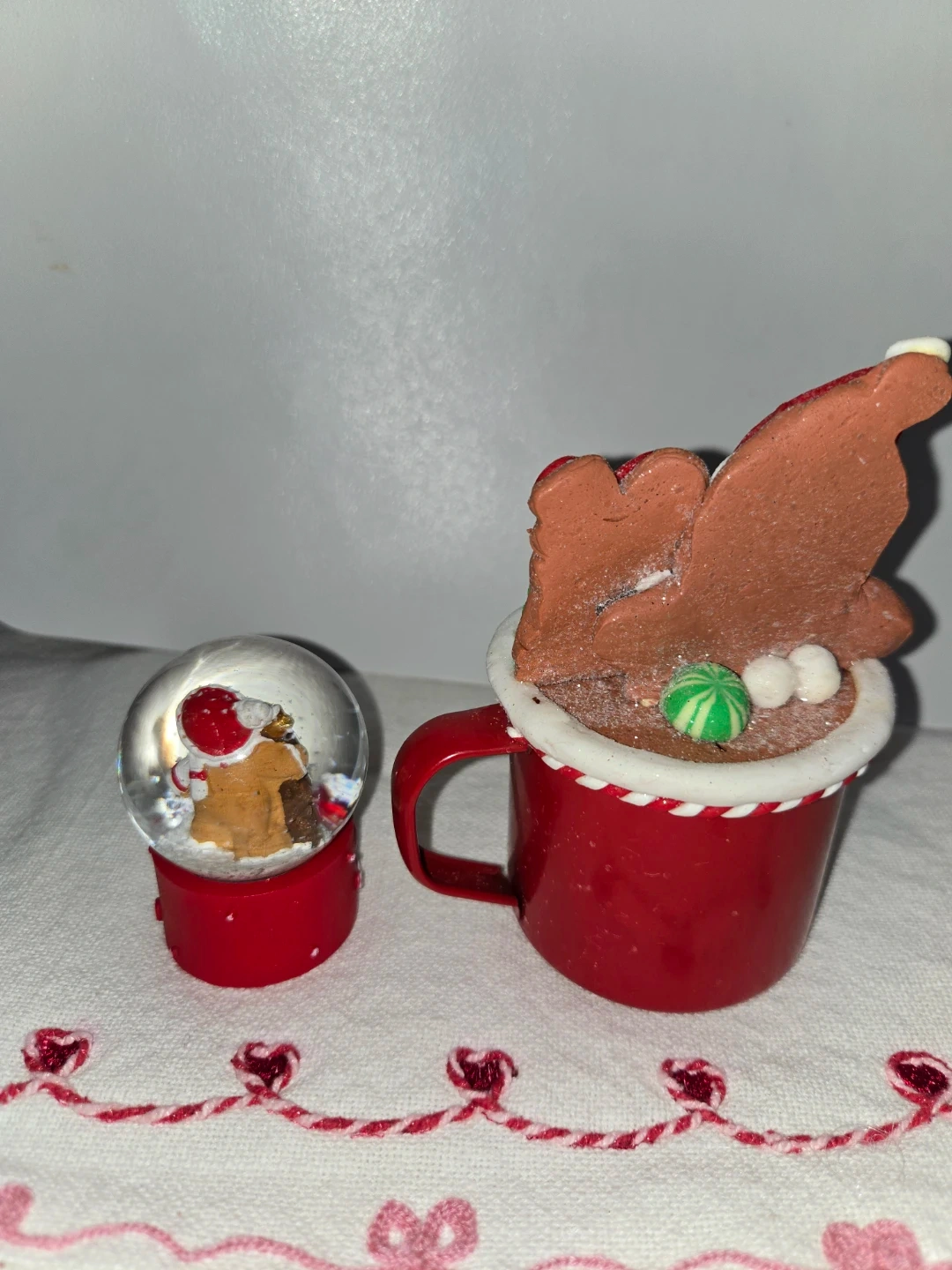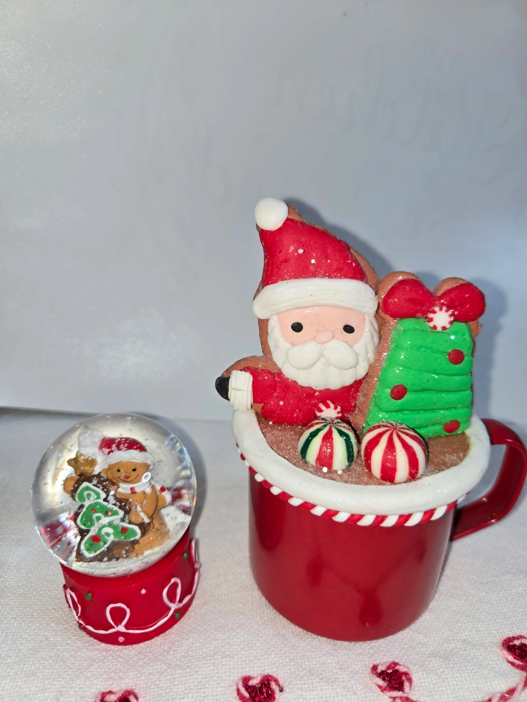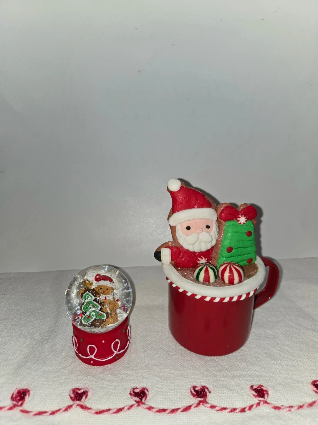 Cute holiday set featuring a snow globe with a gingerbread bear and a red mug decoration topped with Santa and a Christmas tree. Perfect for festive display!