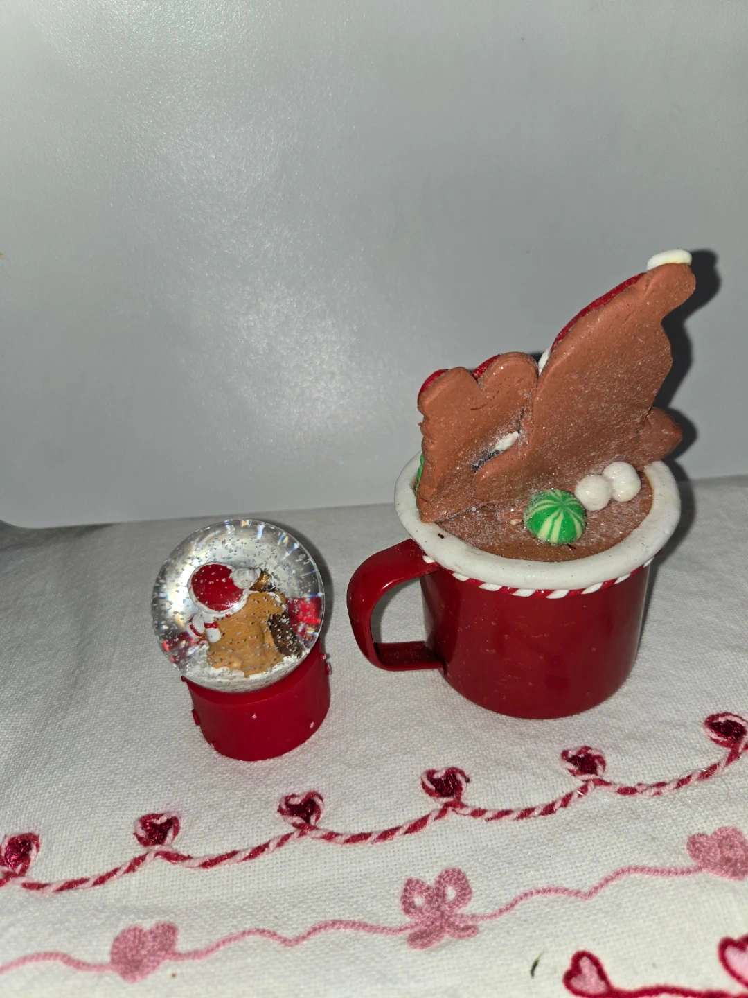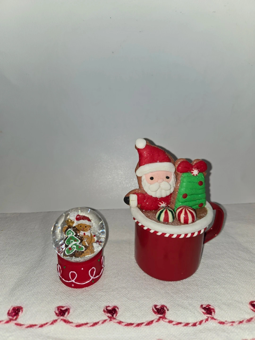 Cute holiday set featuring a snow globe with a gingerbread bear and a red mug decoration topped with Santa and a Christmas tree. Perfect for festive display!