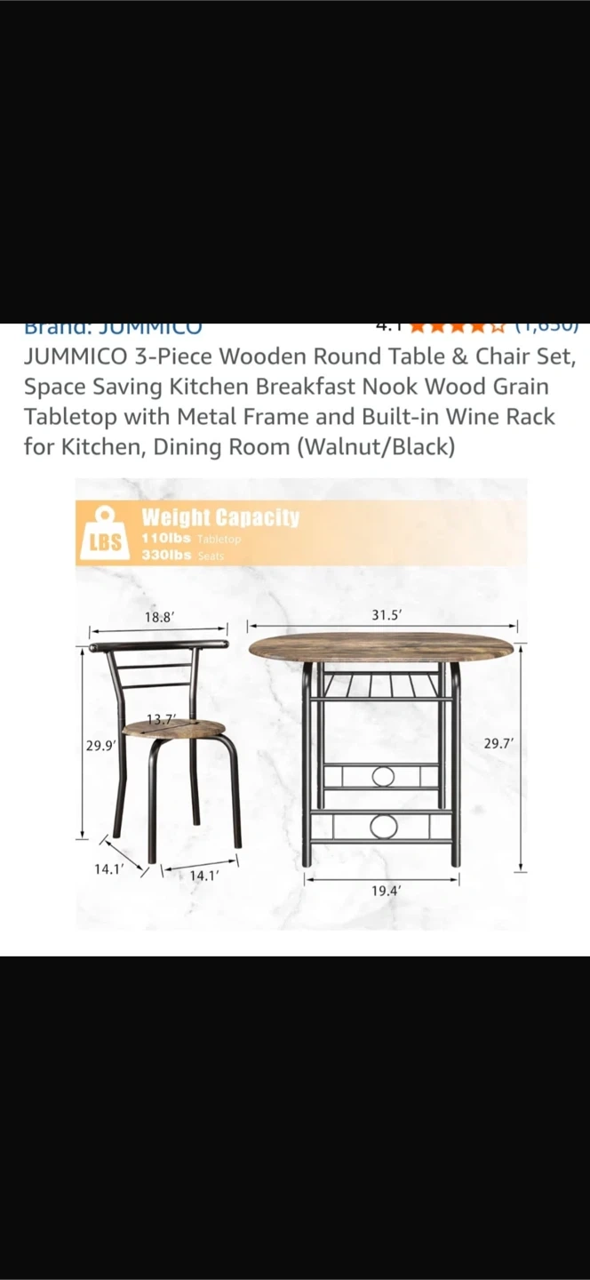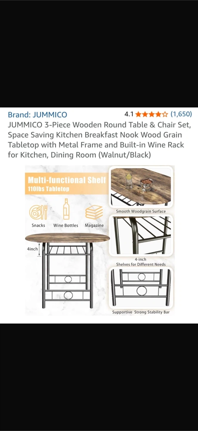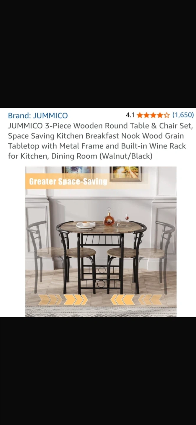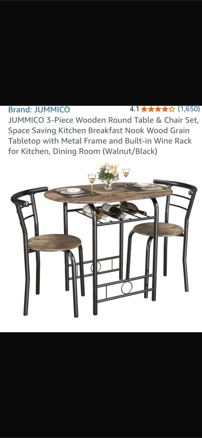 Brand new 3-piece dining set includes a round table and two chairs. It's constructed with a wood grain tabletop and a metal frame. The table features a built-in wine rack for convenience. The chairs have armless seats for fewer restrictions. This compact set is perfect for small kitchens or dining areas.