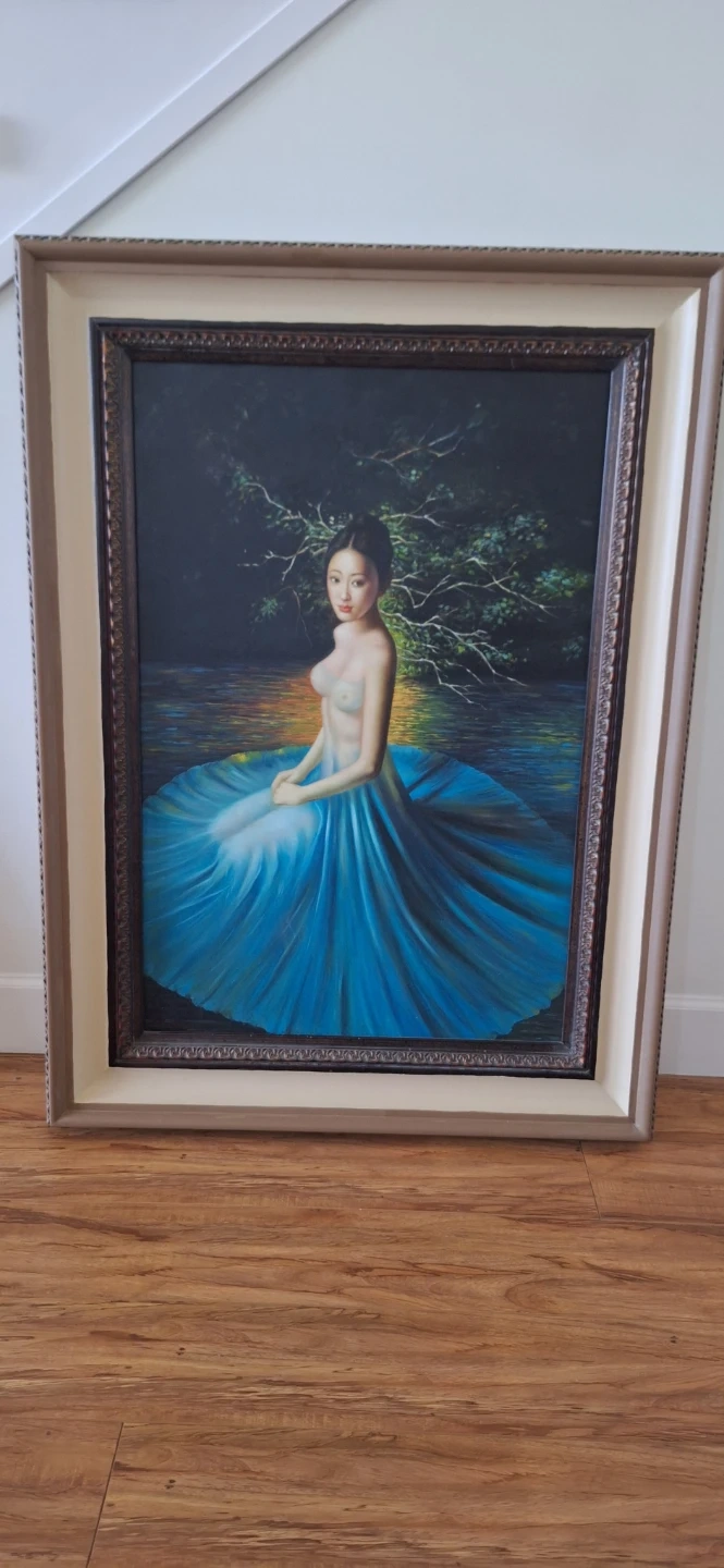 Original framed oil painting of a woman [canvas] in a flowing blue dress sitting in water. The artwork showcases a serene scene with vibrant colours and detailed brushstrokes. It's beautifully presented in an ornate frame, ready to enhance any room's decor.